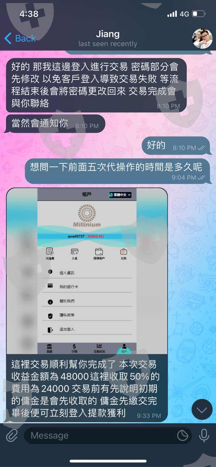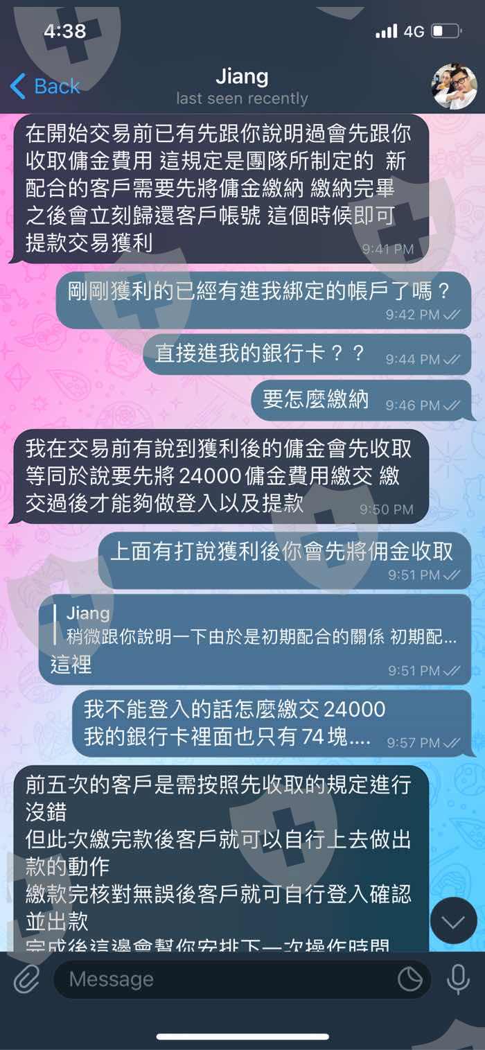 我入金五千 這個人說第一次入金要把帳號密碼給他代操作 操作獲利要給他50%佣金 我連錢都沒拿到就要先給他24000合理嗎? 1.2萬4我沒給他 2.我帳號現在被凍結 3.我五千拿不回來被騙走了 這個人還理直氣壯說我欠他2萬4 傻眼五千都要騙….還不讓我提領