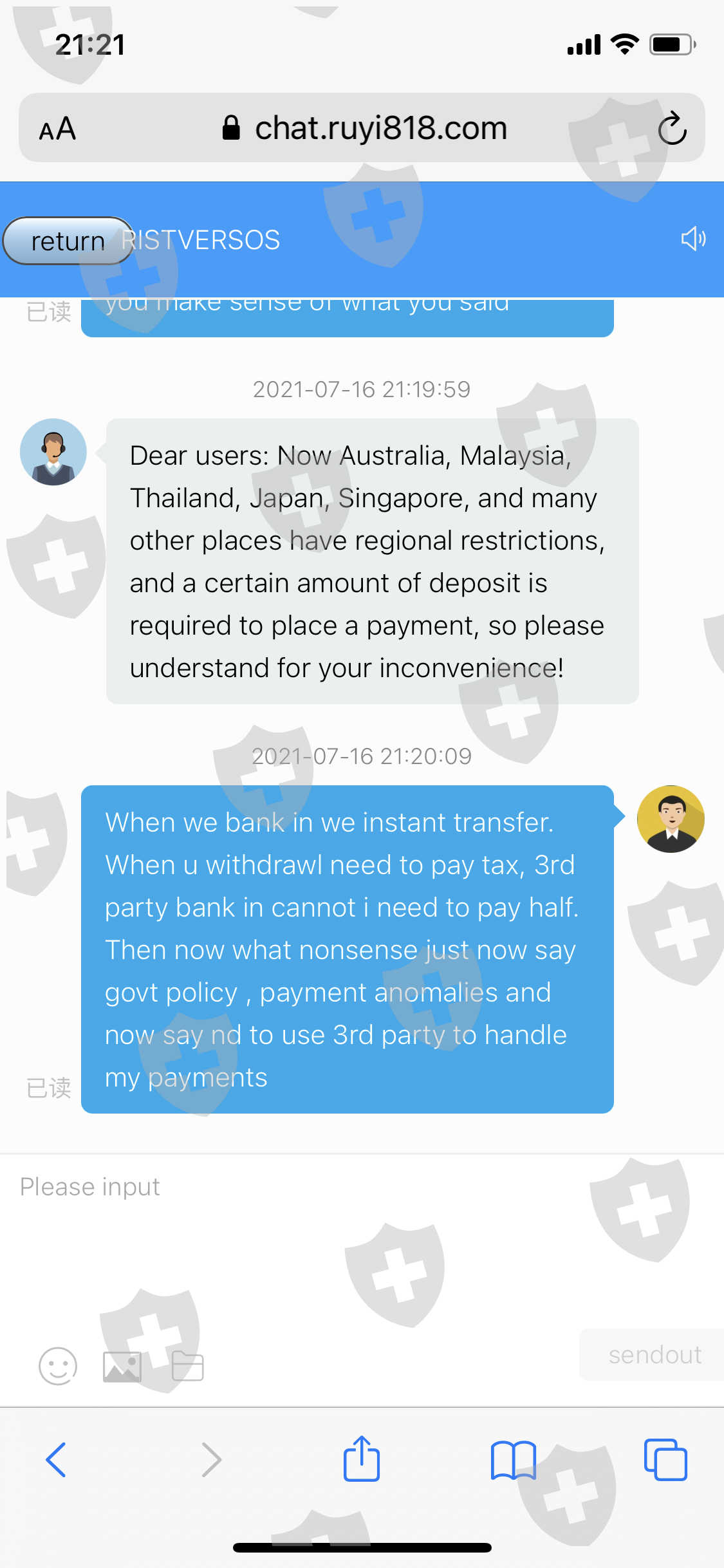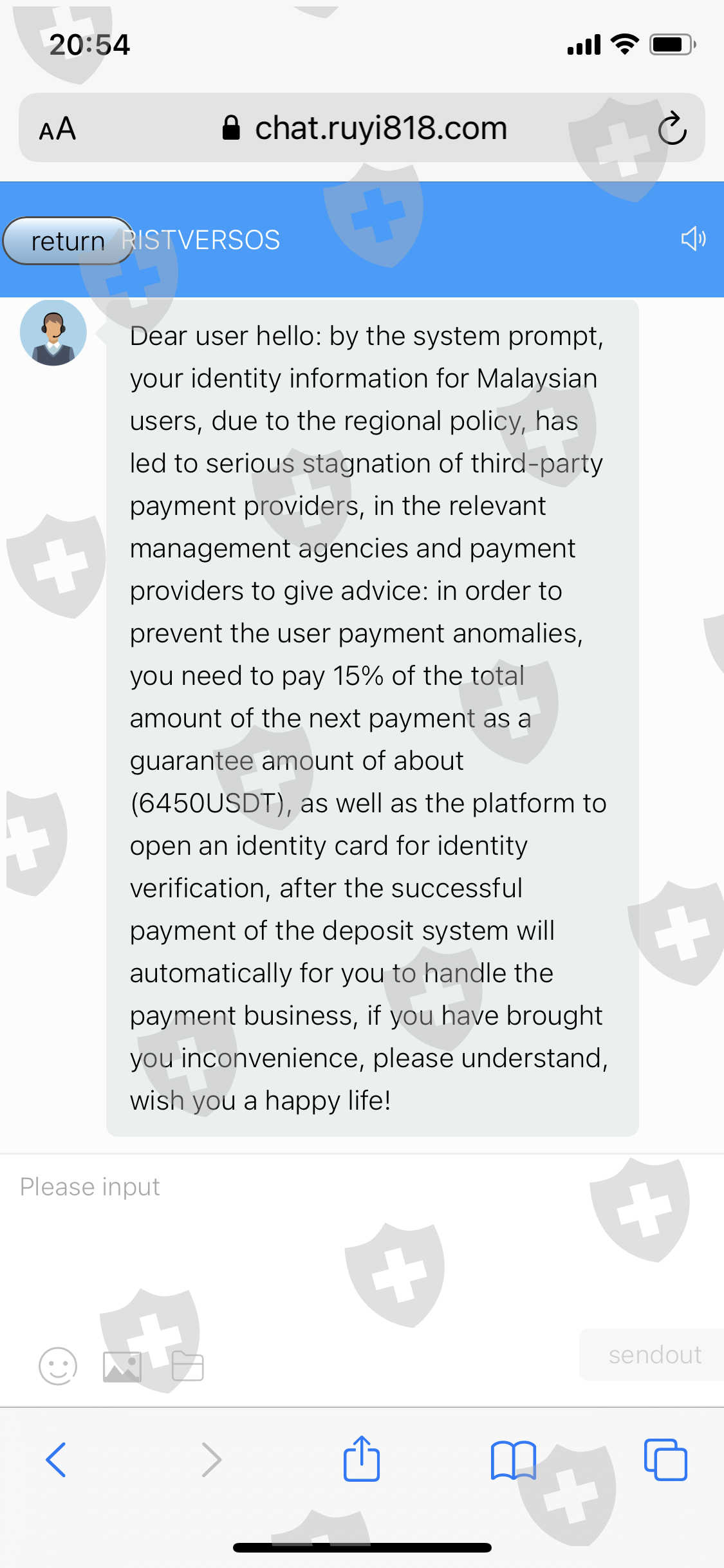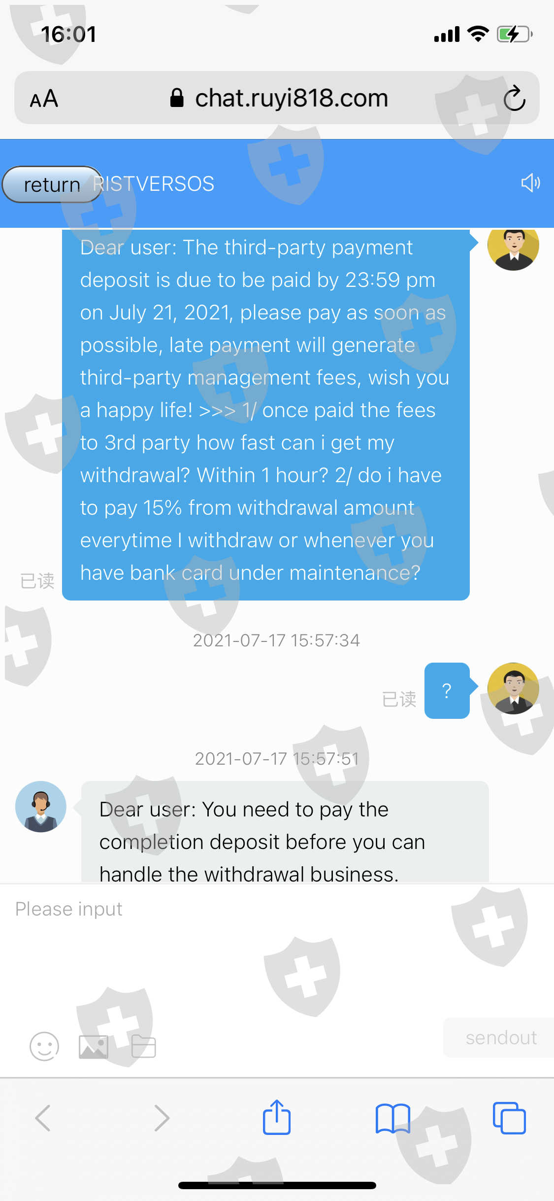 在MT 5上投资了RIST VERSOS,第一次出金$2,885成功,后来都被拒绝出金,要求我交税费、保险费、第三方支付担保费和安全保证金等多项费用,总计 $43,000 。