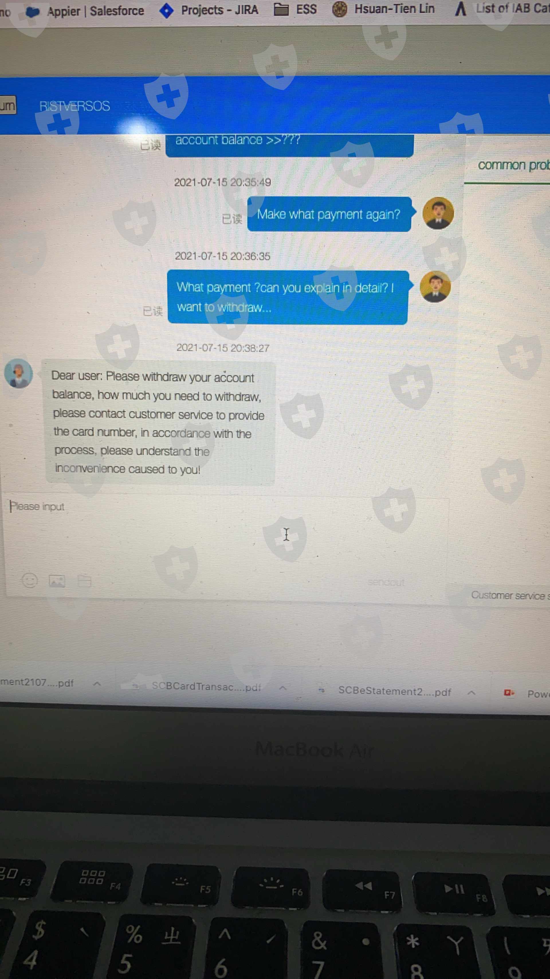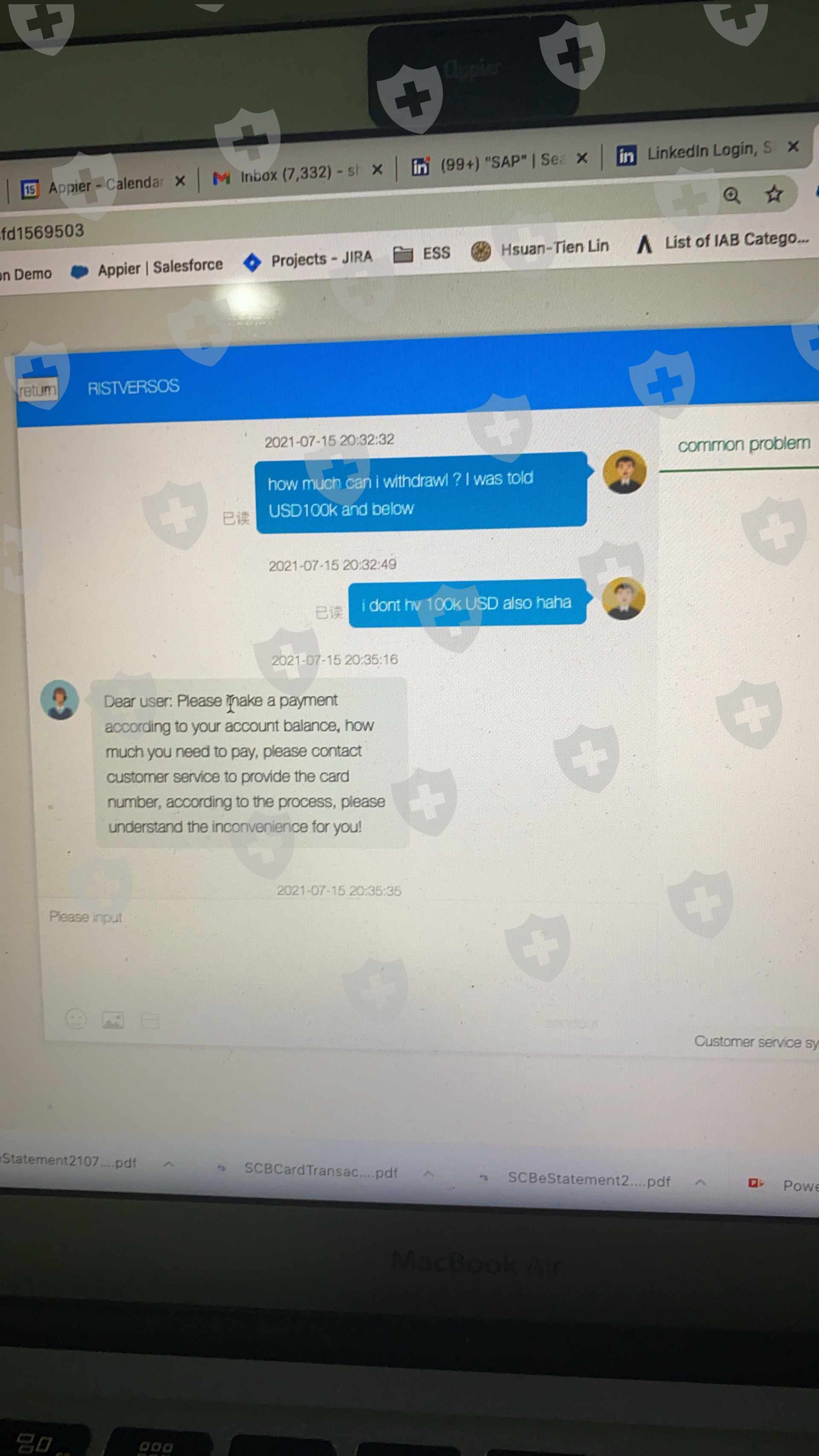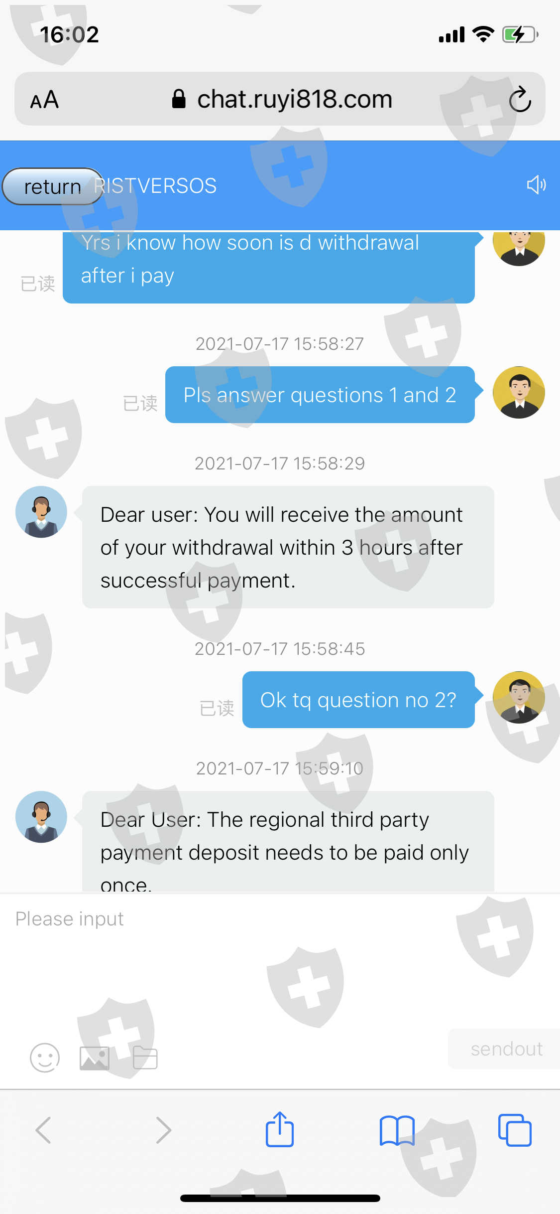 在MT 5上投资了RIST VERSOS,第一次出金$2,885成功,后来都被拒绝出金,要求我交税费、保险费、第三方支付担保费和安全保证金等多项费用,总计 $43,000 。