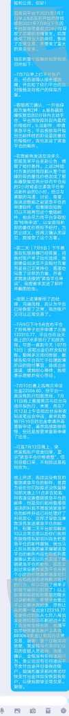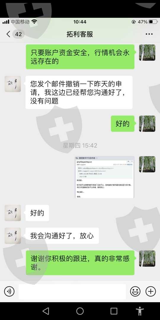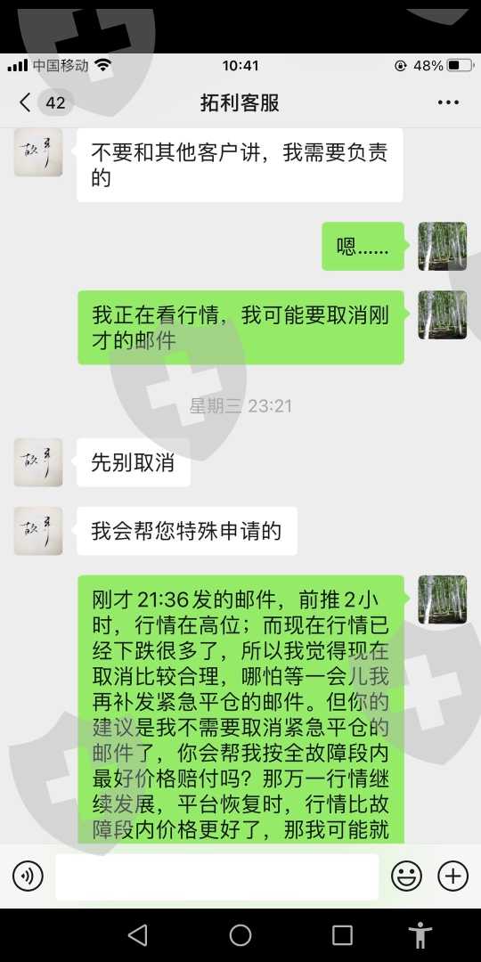 我这边没有及时撤销紧急平仓的邮件,是因为我在你们故障还没恢复期间那天晚上11点多告知拓利客服说要撤销紧急平仓的邮件,但是您们拓利客服很坚决的叫我不用取消紧急平仓的邮件并说已经处理好了叫我放心,这样才导致当晚我没有发送紧急平仓的邮件,到第二天平台故障解决可以正常交易以后你们拓利客服微信私聊我叫我去把紧急平仓的邮件撤销,我也马上听从客服的要求编辑紧急平仓的邮件内容也给拓利客服确认无误以后也发送了撤销紧急平仓的邮件,现在又反过来说要按紧急平仓后两个小时的价格算那就是你们平台和客服有诱导欺诈客户,所以导致了我单子的盈亏被你们扣除了!以上故障期间跟拓利客服的聊天记录都有的,希望平台能公平公正解决我的事,尽快让我的第一笔出金122310.77美金快点到账从七月八号出金处理扣款现在都超过十天了还没有全部到账,也请平台尽快恢复我账户上本金88306.8美金让我回归正常交易,谢谢!整个过程清清楚楚,我全程与代表你们公司的客服人员咨询、沟通、确认,全程没有任何违规行为,贵公司没有任何理由不予支付出金并归零我的账户。现强烈要求拓利贵司尽快支付出金并如实恢复我账户,以便我能够正常交易。谢谢。