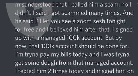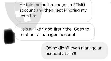 Max Zuniga 承诺他会管理 FTMO 账户后,我损失了 1750 美元。 Max 只是保管钱,没有管理任何账户。同样的事情也发生在我朋友身上。这个 Instagram 上叫 Max Zuniga 的人和我聊天,声称他是一名专业的客户经理,如果跟他一起投资,我们将在成功交易后获得巨额资金,我相信了。现在他跑了。