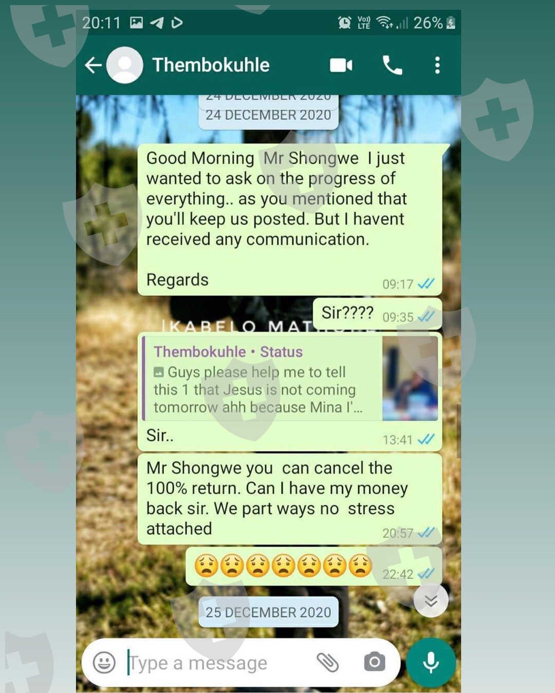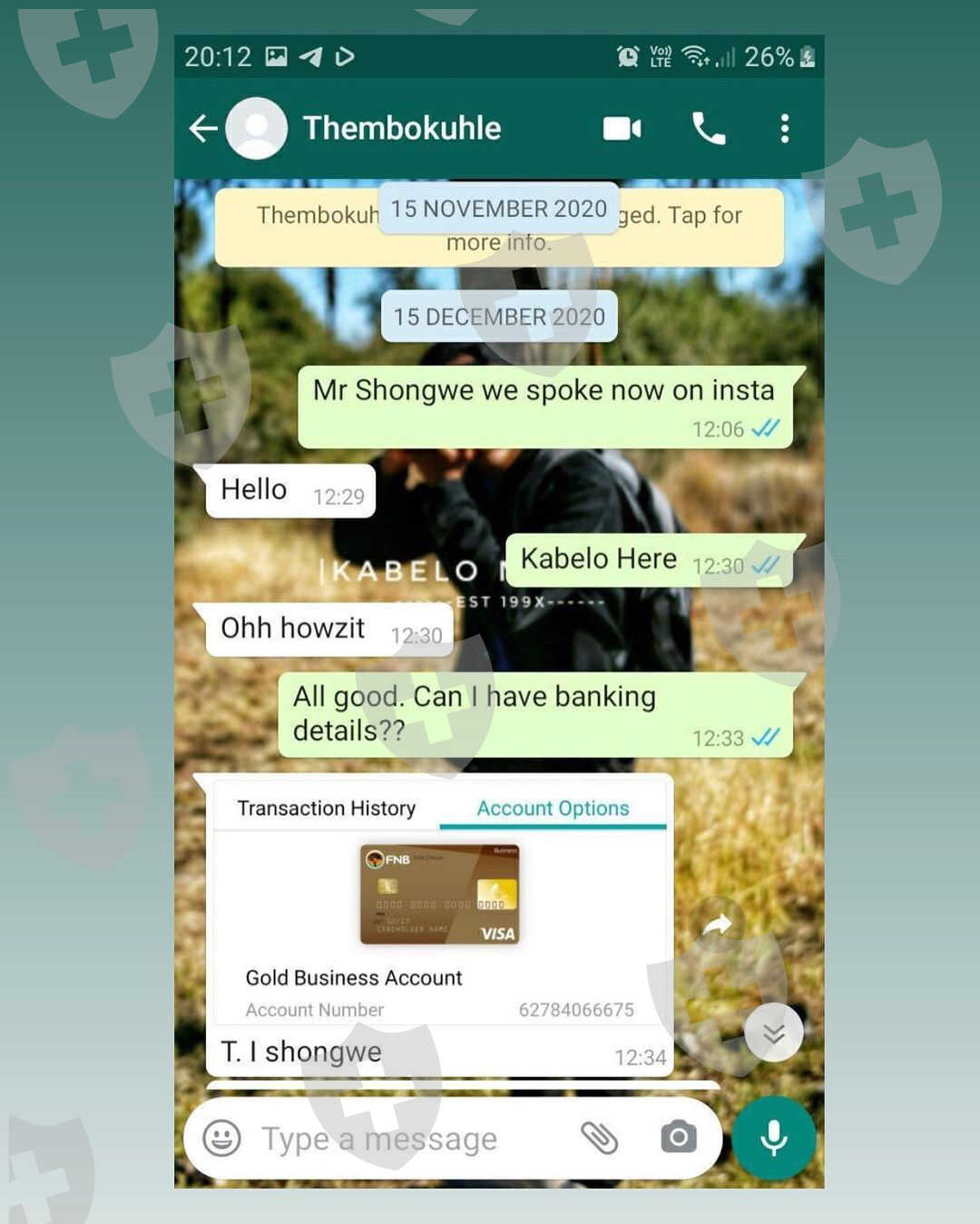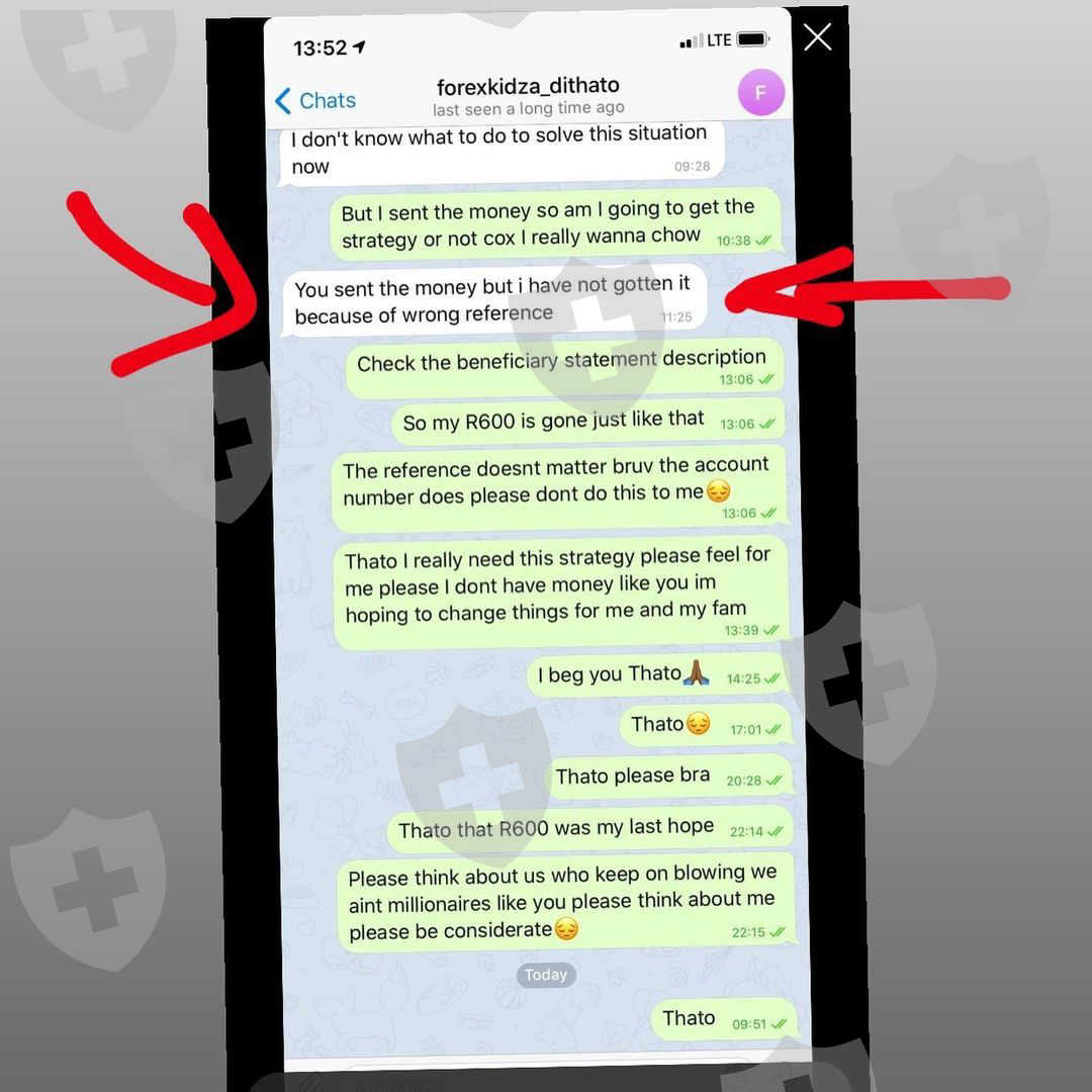 此人在 INSTAGRAM 上创建了一个 FAGE 并将其命名为 (THEMBOKUHLESHONGWE), 他声称自己是二元外汇TR外汇交易商, 他正在诱导人们入金,以换取双倍的利润,是一个专业的诈骗犯, 我和我的朋友收到钱并寄给他 500 美元,他说他将帮助投资并给我们带来两倍收入,后来就拉黑了我们。以下是图片。