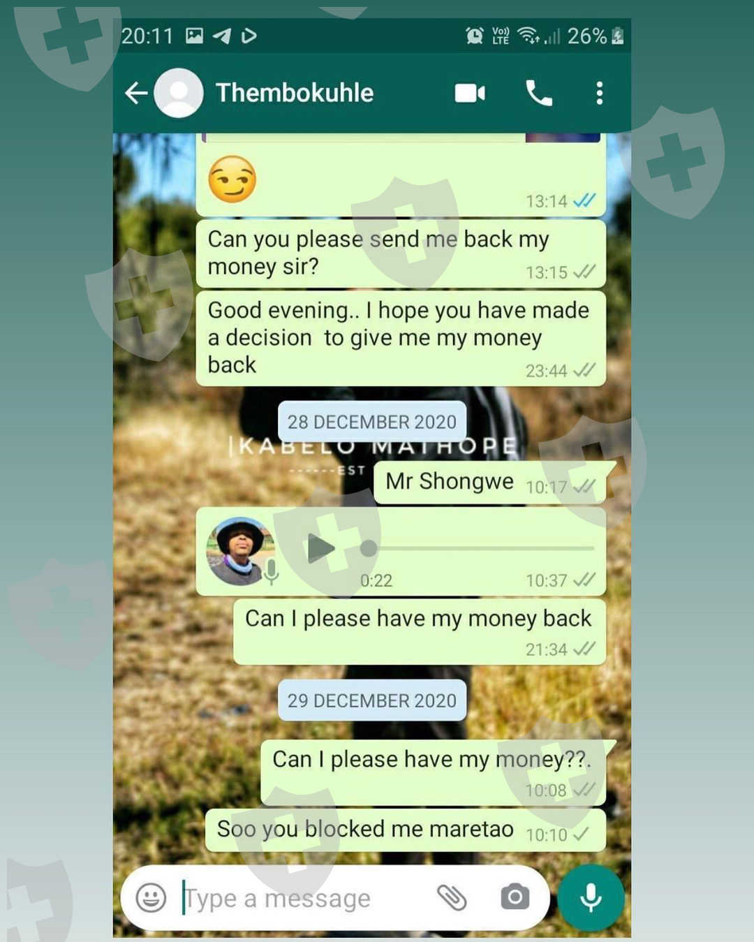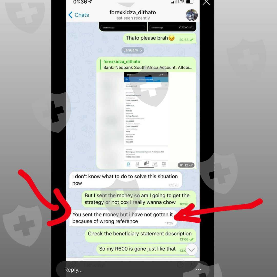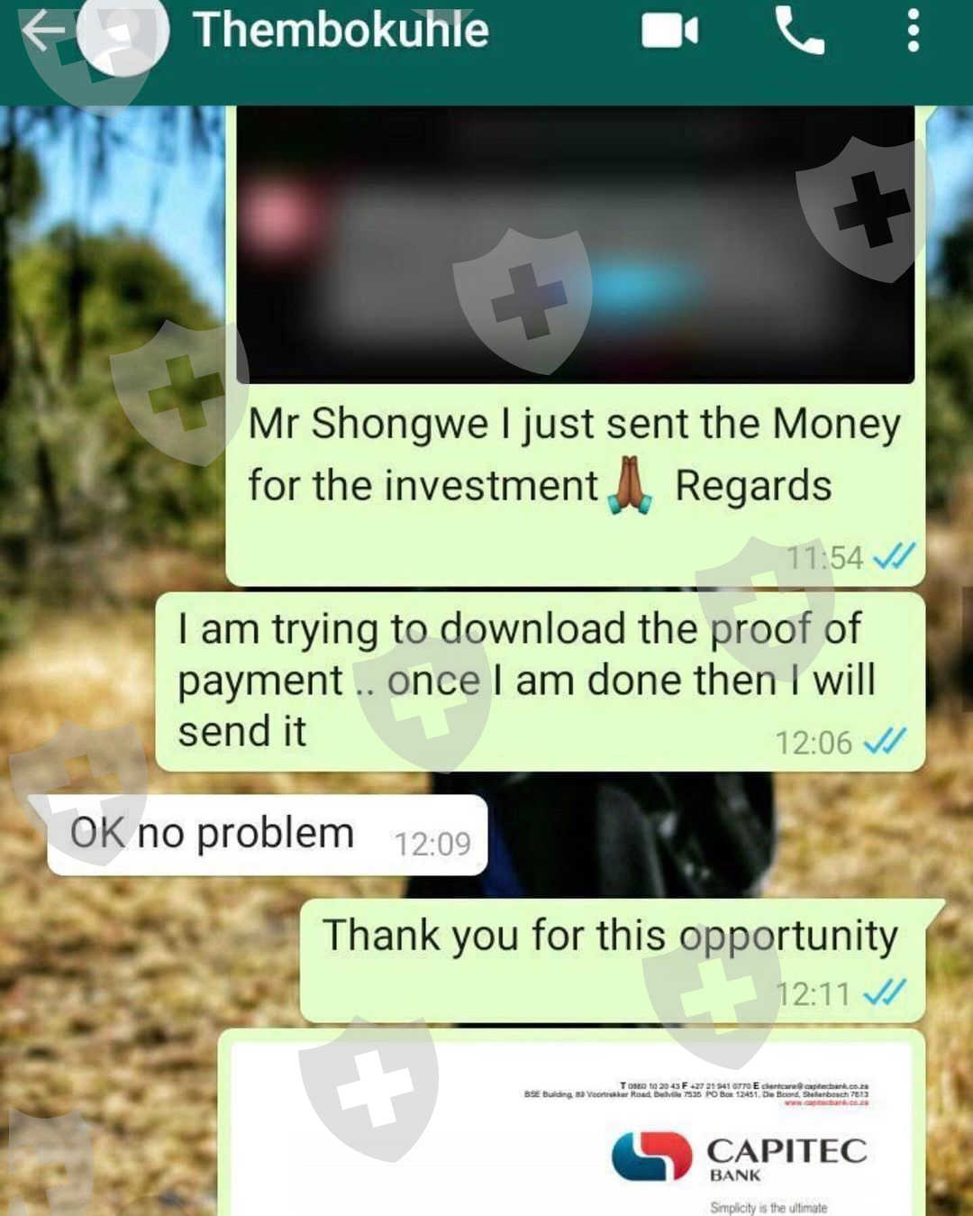 此人在 INSTAGRAM 上创建了一个 FAGE 并将其命名为 (THEMBOKUHLESHONGWE), 他声称自己是二元外汇TR外汇交易商, 他正在诱导人们入金,以换取双倍的利润,是一个专业的诈骗犯, 我和我的朋友收到钱并寄给他 500 美元,他说他将帮助投资并给我们带来两倍收入,后来就拉黑了我们。以下是图片。
