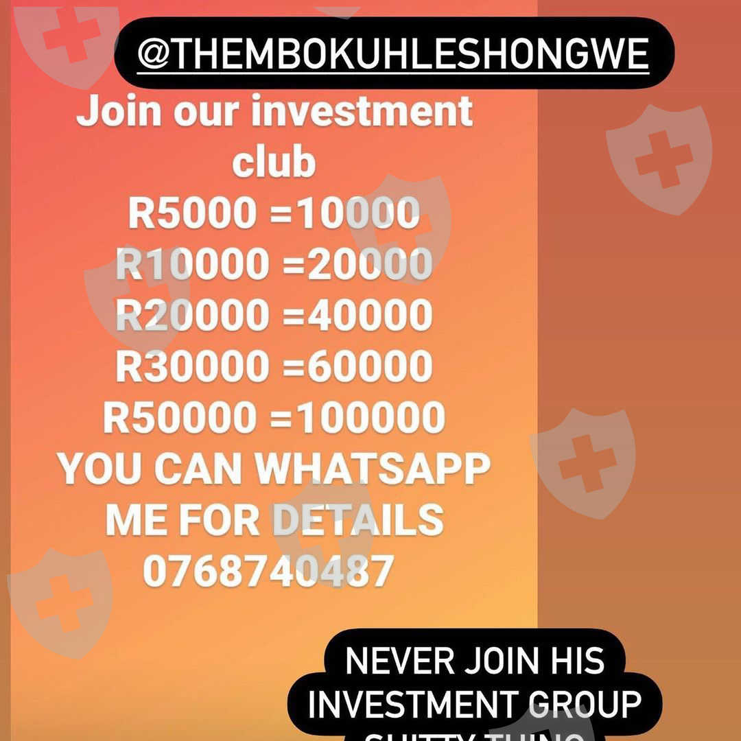 THIS PERSON HAS CREATED A FAGE ON INSTAGRAM AND NAMED IT (THEMBOKUHLESHONGWE) HE IS CLAIMING THAT HE IS A BINARY FOREX TRADER HE IS COLLECTING MANY PEOPLE MONEY IN RETURN OF DOUBLING THE PROFIT.