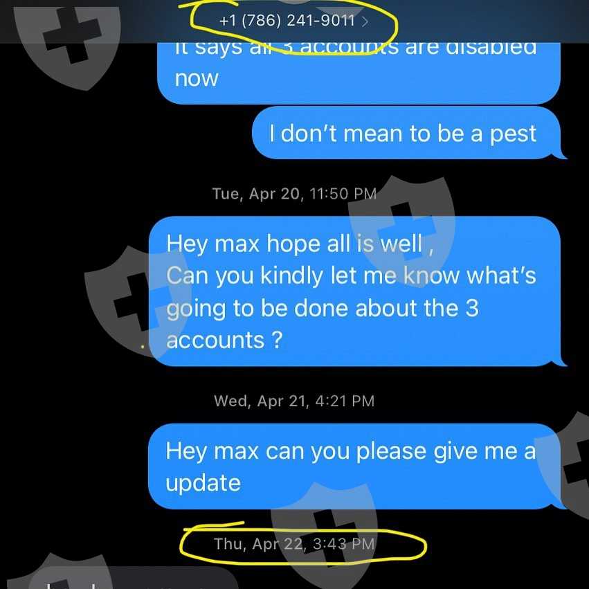 Anyone who’s local or lives near Max or is a friend or an acquaintance will know this is Maxes phone number. Proof folks. An easy $3750 for Max for failing all 3 accounts. Stay away from such type of scammers