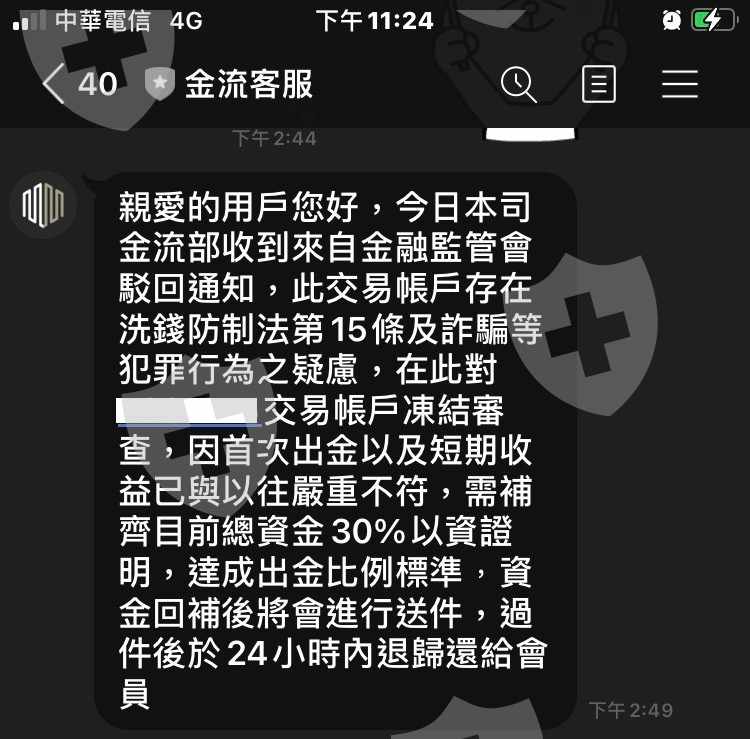 要出金就要先繳總資金的30%,不管什麼什麼事情都不會凍結帳號,如果真的被凍結,警察也會找人,警察也沒來找我,所以這是詐騙的黑平台喔