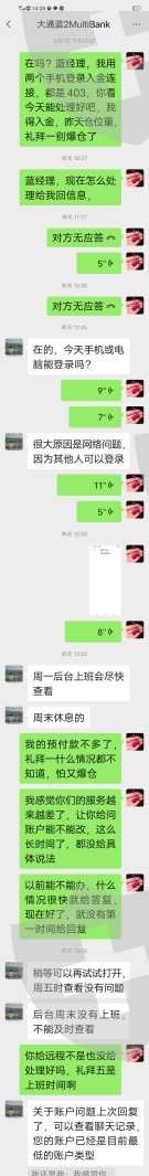 大通金融,几天时间无法入金,让客户爆仓,客户经理推脱责任,期待大通有关领导解决!