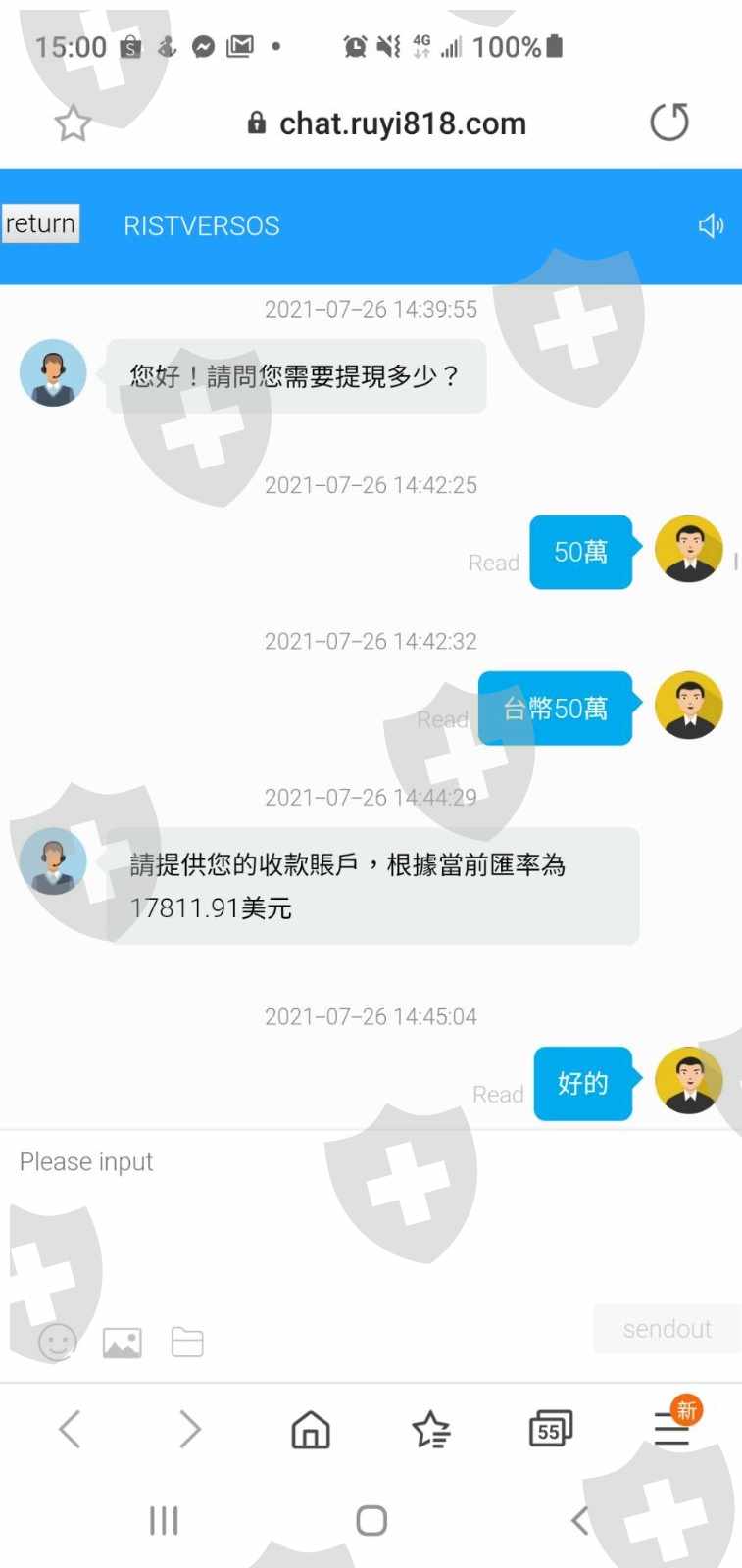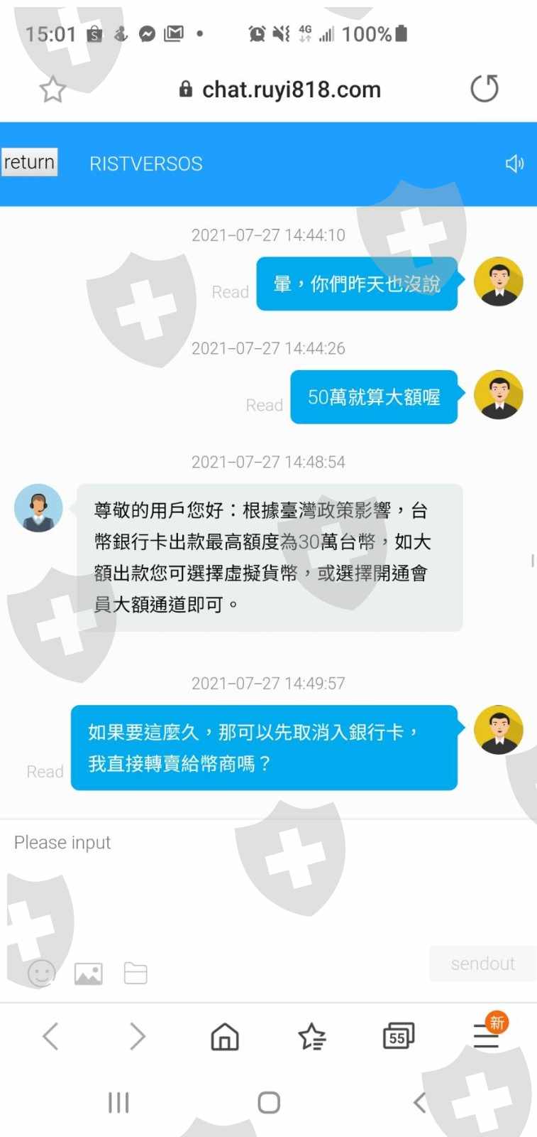 在MT 5上投资了RIST VERSOS,第一次於7/18從火幣錢包入金$2005(usdt,共入金$2015,$10由平台抽走)成功,後分別於7/20入金$6605(usdt),7/21入金$4458(usdt),7/22入金$3303(usdt)於,前後4次共入金$16381,期間聽從疑似與平台同夥詐騙操作黃金期貨,第一次收益為360.99(usdt),第二次為$4293.5(usdt) ,帳戶庫存金額共計$21,035.49(usdt),期間分別要求平台提金共3次,第一次於7/22提金成功$1,000(usdt),第二次7/26要求提金$17,811.91(usdt=$500,000新台幣)平台開始以結算系統升級、提幣金額太大需要1-3天程序、台灣地區提出款金額限制..等各式問題延遲不出款,未免詐騙同夥與平台起疑,故用其他藉口要求讓我提幣後才可能再次入金方式,於7/28第三次順利提幣成功$1,000(usdt),前後共申請提幣3次($1000+$17811.91+$1000),僅成功提幣$2,000(usdt),爾後,當我拆穿詐騙同夥跟平台後,對方即扣留先前要求提幣的50萬新台幣,最終並未出款給我,而是打回入原帳戶,剩餘仍有金額為$19025.49(usdt)未出金給我。