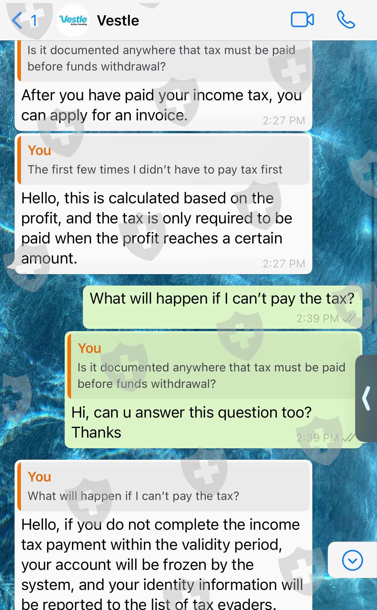 出金需要先交20%税,不要再被他们骗了,这是个骗局,远离https://www.Vestle pra.com/#/。