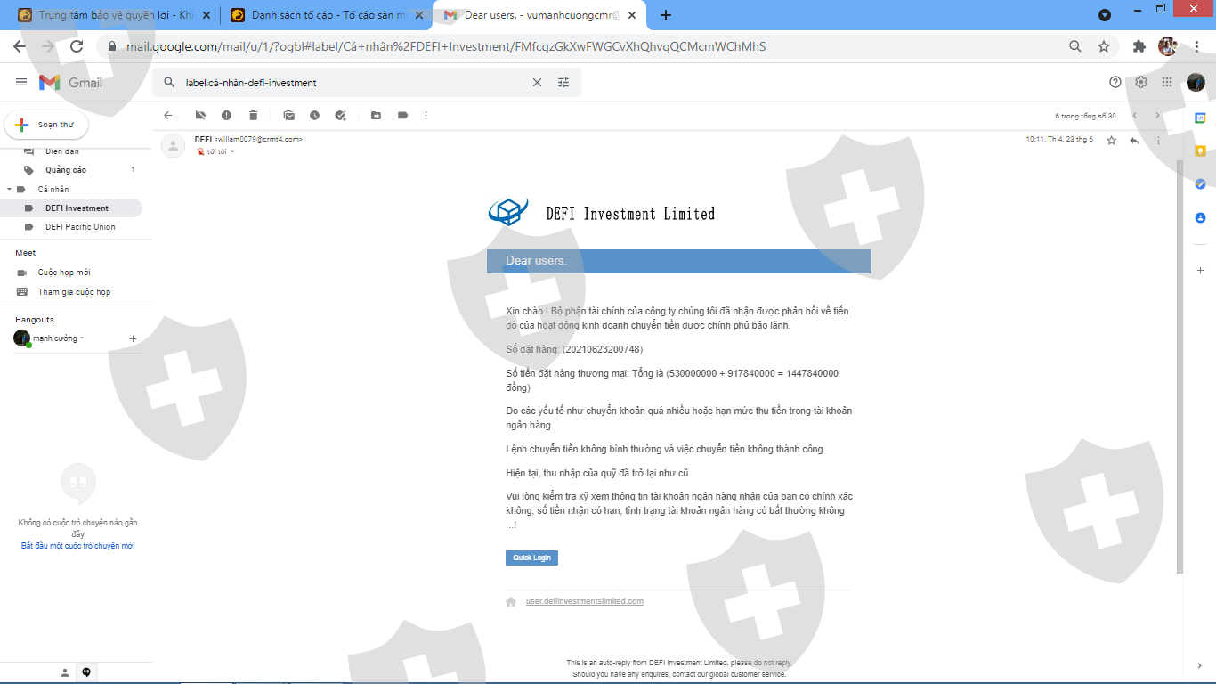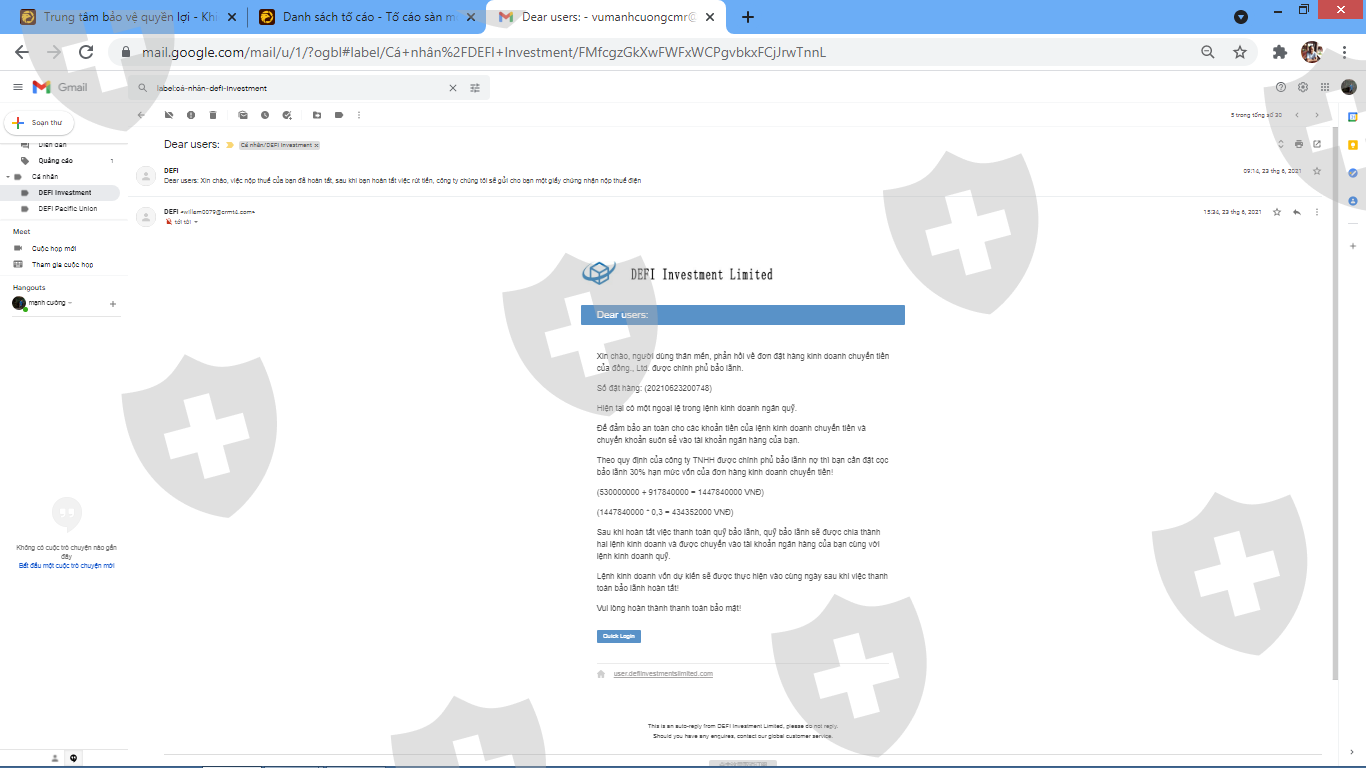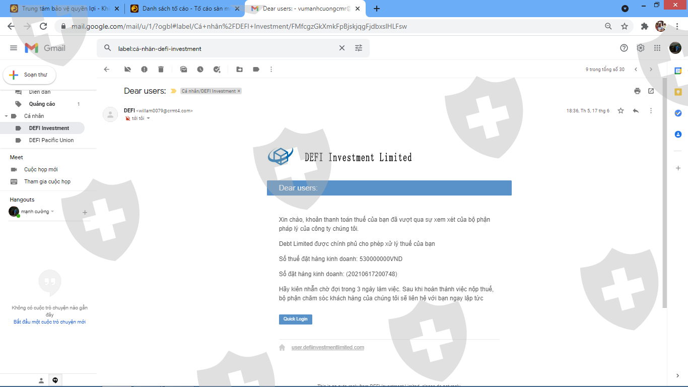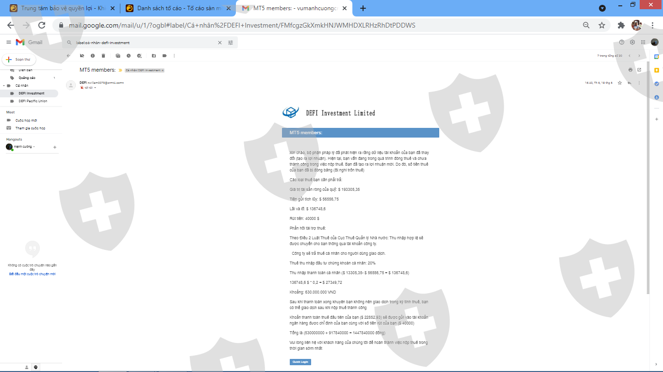Tôi đã đầu tư vào sàn này theo một người quen qua mạng vào ngày 17/05/2021, sau khi mở tài khoản tôi được thưởng 50 USD. Khi tôi yêu cầu rút tiền (40.000 USD) thì sàn bắt tôi phải nộp 20% trên tổng số tiền lời đã kiếm được cho họ để họ thực hiện thủ tục nộp thuế thu nhập cá nhân cho tôi trước khi chuyển trả tiền rút cho tôi là khoảng hơn 22.000 USD, sau khi tôi chuyển tiền cho họ xong thì người quen này yêu cầu tôi giao dịch tiếp và phát sinh tiền lãi. Ngay sau đó chăm sóc khách hàng của sàn thông báo số tiền tôi muốn rút cộng với số tiền thuế đã nộp cho họ (40.000 + 22.000 = 62.000 USD) bị đóng băng do tôi đã giao dịch trong khi làm thủ tục nộp thuế thu nhập cá nhân và bị nghi ngờ trốn thuế. Sàn yêu cầu tôi nộp lại thuế cho toàn bộ số tiền lãi đến thời điểm rút (bao gồm lãi cũ và lãi phát sinh khi đang làm thủ tục nộp thuế) là hơn 27.000 USD. Sau khi tôi lo đủ tiền nộp khoản thuế này xong thì sàn thông báo tài khoản ngân hàng của tôi có bất thường và tiền hiện đang nằm tại công ty bảo lãnh chính phủ Việt nam nào đó, họ lại yêu cầu tôi phải nộp một khoản bảo lãnh để có thể nhận được khoản tiền đã yêu cầu rút và số tiền thuế đã nộp lần trước với số tiền bằng 30% số tiền (khoảng 18.000 USD). Họ nói rằng sau khi tôi nộp xong khoản bảo lãnh này thì sẽ chuyển số tiền rút của tôi cùng với số tiền bảo lãnh này vào tài khoản ngân hàng cho tôi. Đây là quy định của công ty bảo lãnh chính phủ Việt nam nào đó.Rất mong các bạn hỗ trợ tôi