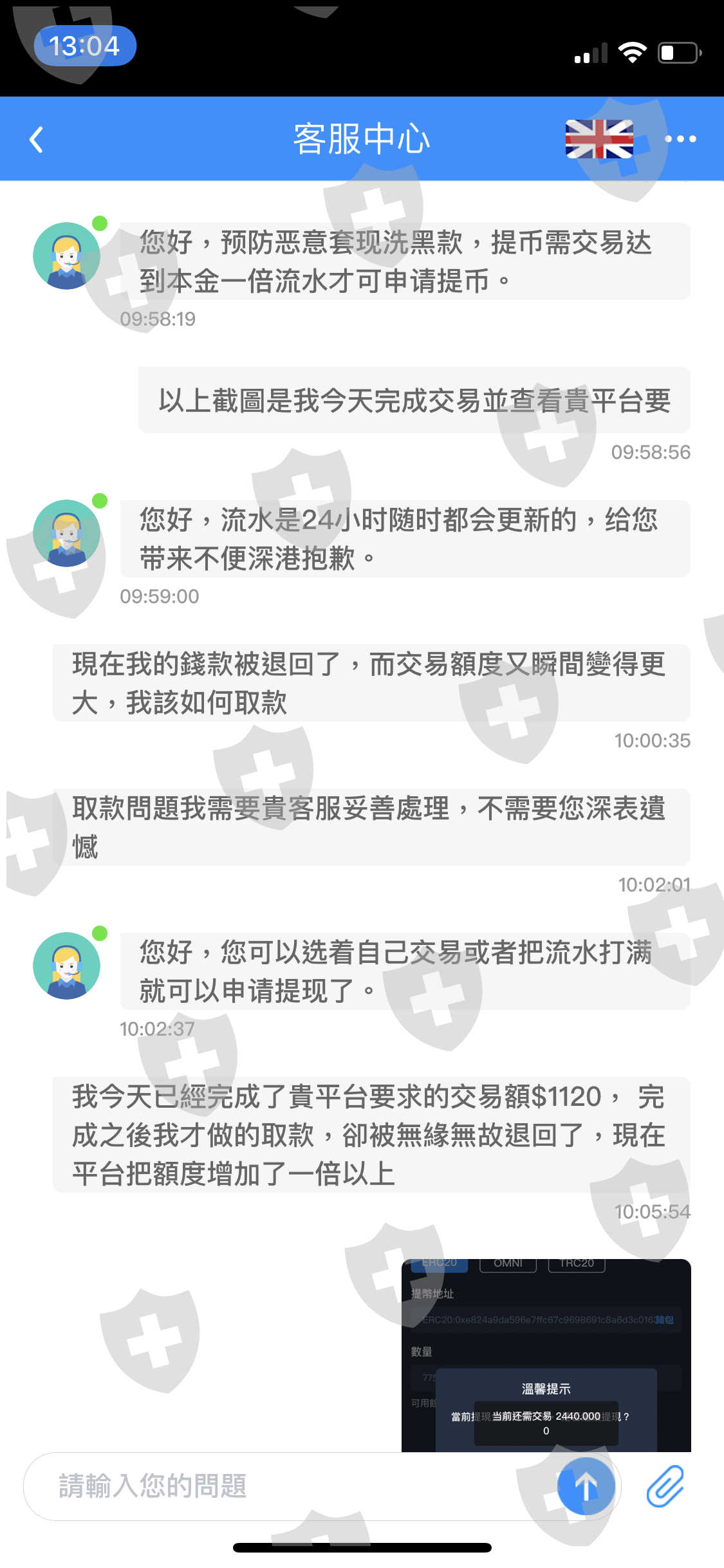 本人在今年7月19日在www.tickmillex.com網站下載了tickmill 的app 先後存入1800usdt資金交易數字貨幣合約,應不適應交易方式希望取回投資款,但平台要求提款需完成其自訂的交易流水或存款要求,為減少損失取回自己投入的款項,本人只能選擇在平台進行交易,今天8月12日我在完成了平台給出的交易流水要求後,申請取回僅剩一小半的本金,但還是被平台拒絕退回了。同時該平台系統顯示的要求交易的金額莫名其妙再次增加了一倍。這就意味著一般客人正常根本無法從該黑平台取出任何款項!