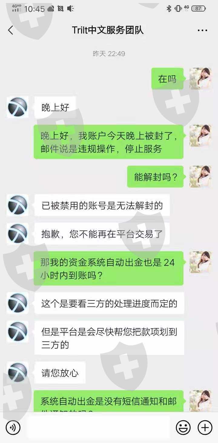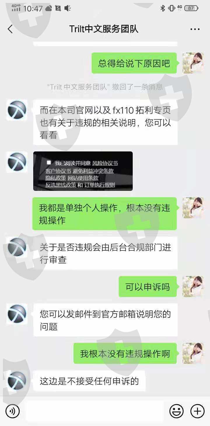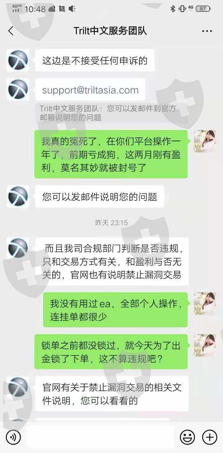 本人在拓利平台合规操作一年多,之前一直亏埙没什么事情,最近两个月开始盈利却在昨晚突然被封账号,平台发了封邮件告知后就封了我账号,现在MT4已经登录不上,官网账户也登录不上,问客服也不给说原因,让发邮件给官网,发了也未收到任何恢复