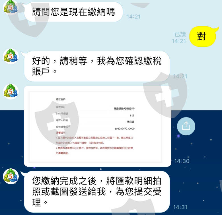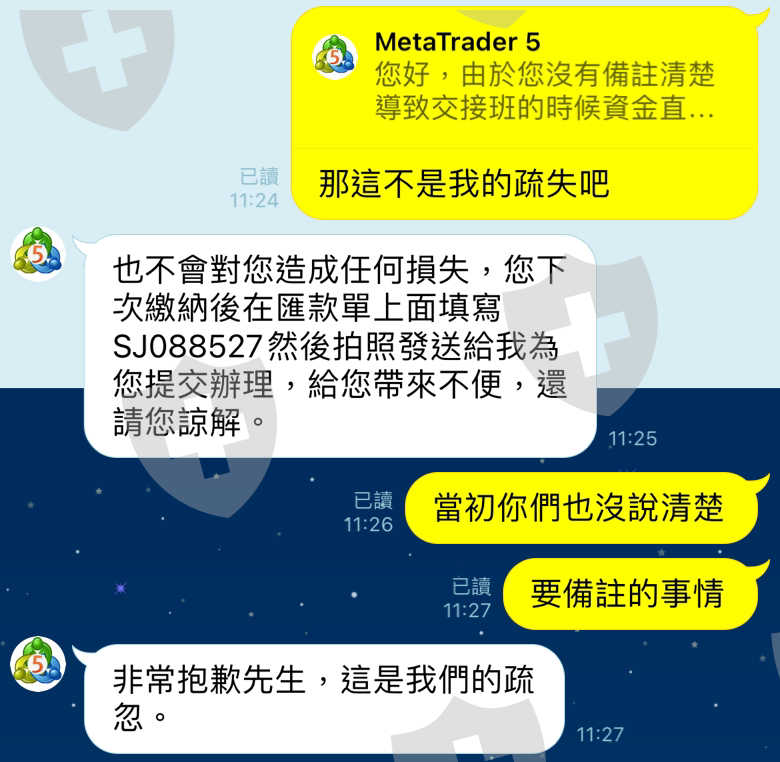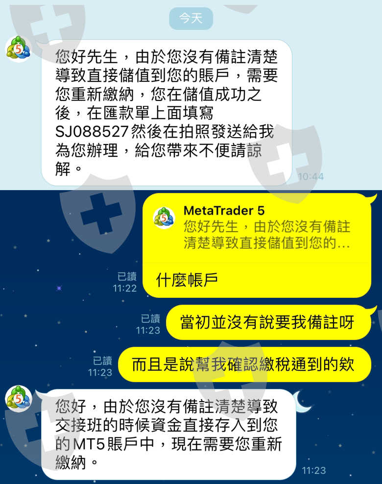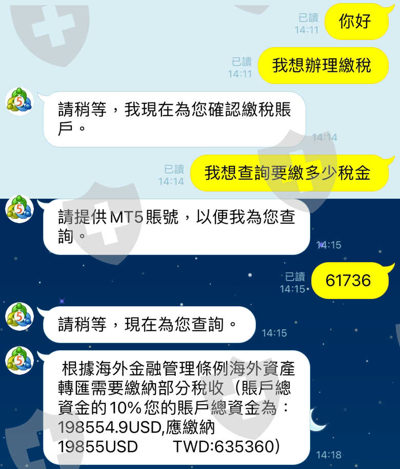 我在international forex 註冊了一個交易帳戶(帳戶是61736),近期在辦理出金的過程中,因爲提領的款項過大(70000美元),客服告知說依海外資產轉匯需繳交部份稅收,稅收的部份是帳戶資金總資產的10%(總資產為198554),所以我要繳納18955的稅金,才能提領出金,如果逾期未繳會產生稅收的1%的滯納金,嚴重的話將會凍結我的帳戶,後續依照客服的說明也按照他們的方式完成稅收的繳納,但在交談的過程中從未提及說要在匯款單上面註明相關的說明或備註事項,只有詢問我是否要辦理繳稅,相關的金額數據也都是客服提供給我的,隔天吿知我說因爲我的匯款單沒有註記金額用途,導致匯款單金額存進了我的交易帳戶中,所以以這理由要求我在繳納一次稅金,這樣才能繼續辦理出金,經過相關的查證,該客服也的確承認是他們自己作業上跟交接時的疏失,才會導致這種狀況,那這樣更不應該要求我在繳納稅金..
