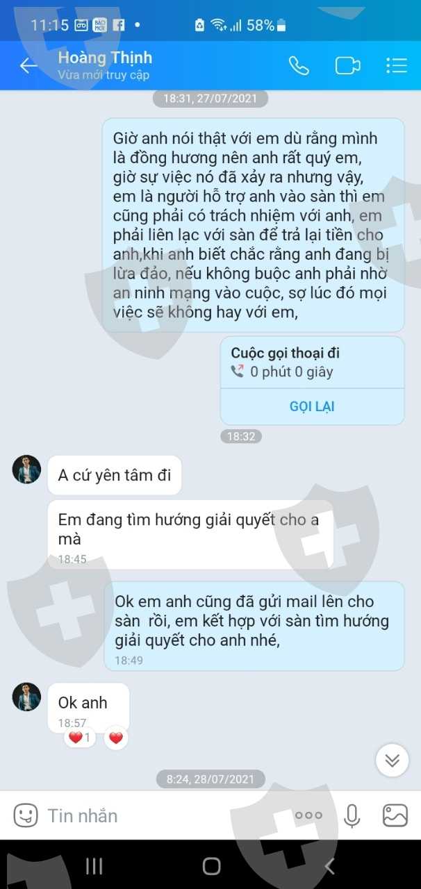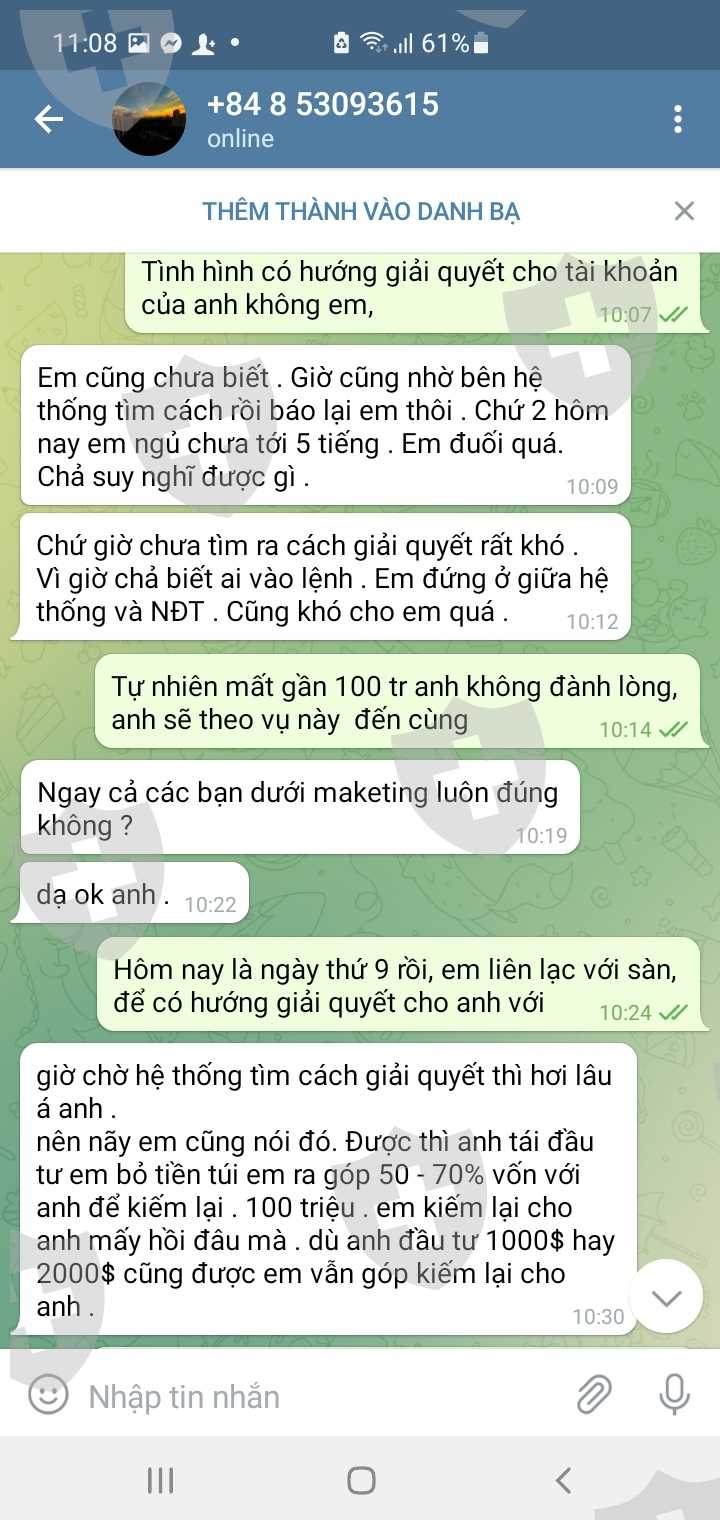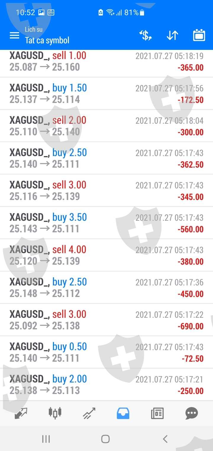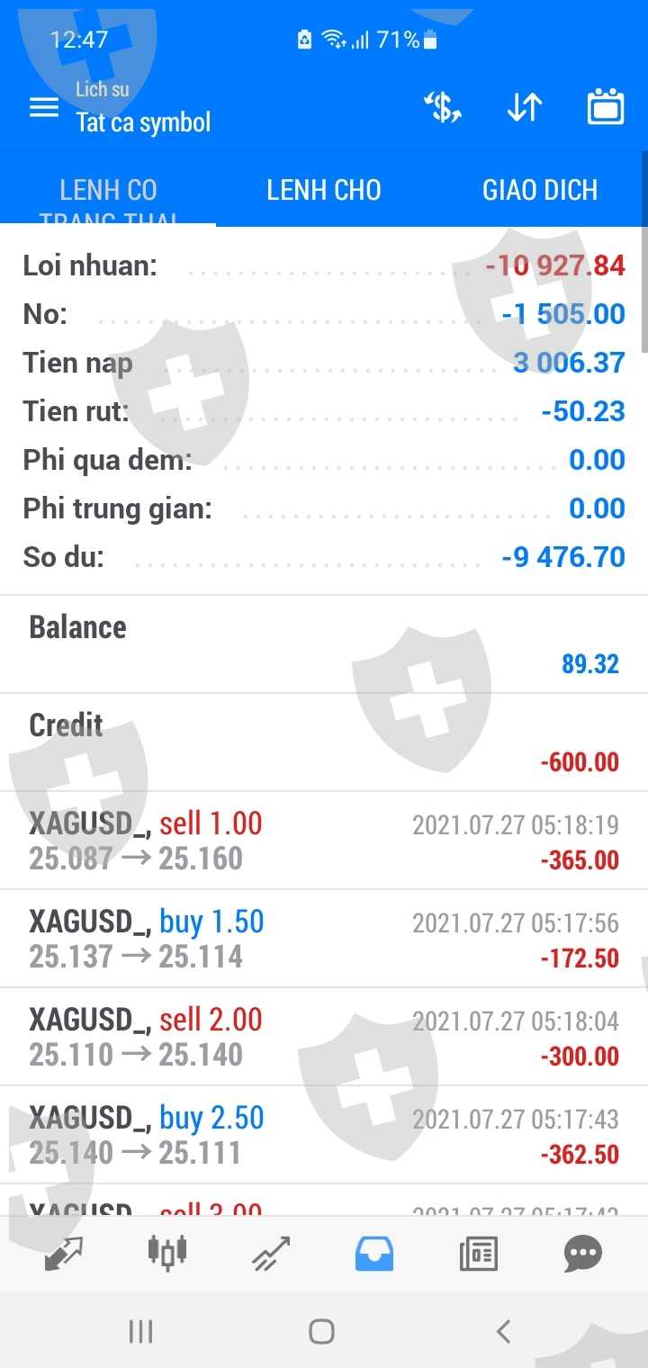 Tôi tên: Đinh Kháng chủ tài khoản 1018138-dt 0913409595.Ngày 26-06 tôi quyết định đầu tư vào sàn Acx với một số tiền 7000usd, cho đến ngày 27-7 thì tôi phát hiện tài khoản của mình bị cháy, mặc dù tôi không giao dịch, khi mở lịch sử giao dịch ra thì tôi mới biết, vào lúc 5h sáng, Sàn Acx đã can thiệp vào tài khoản của tôi trong thời gian 1 phút họ đánh 12 lệnh XAG với khối lượng lớn khiến tài khoản của tôi bị cháy, sau 14 ngày khiếu nại sàn Acx vẫn im lặng không một lời giải thích,