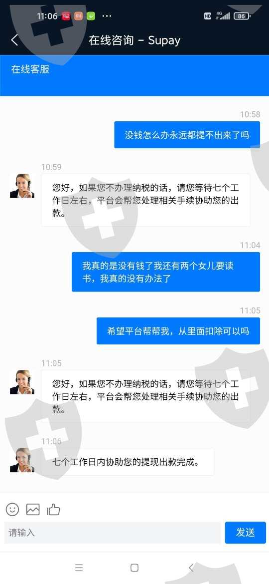 我在SuPAY联通速汇有限公司投资钱,提现的时候说我银行卡信息错误,需要打款8000才可以出款,我东借西借,借到钱打款后提现了又不到账说是银联监控拦截需纳2000税才可以到账,我没有纳税客服说让我等一个星期才可以到账,可是我等了十几天了还没有到账,supAY联通速汇有限公司是诈骗公司,现在App也登不上去