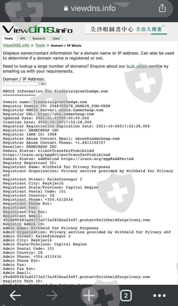 financial growth edge是虚假投资平台。原因 1. 虚假地址 2. 匿名所有权。 3. Namecheap 域名。 4. 非法传销投资。 5 假域名。