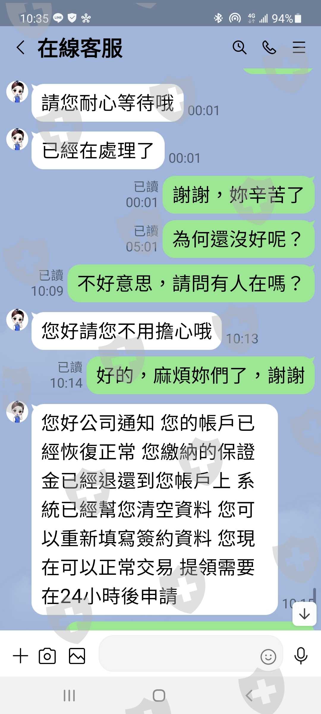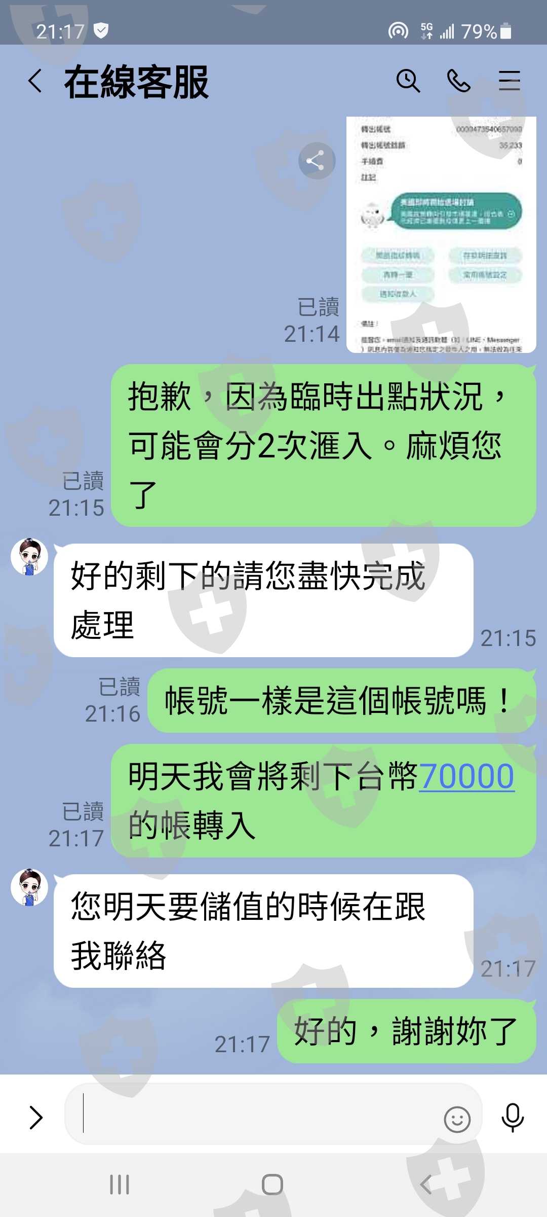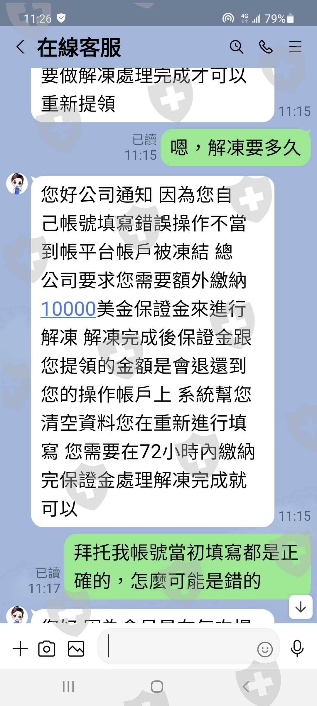 到了7月初,我投資本金已有近31萬,看到的獲利額共為2萬美金,等於近60萬,於是我申請提領,結果該金融以我帳號問題無法提領,要求加注1萬美金後解凍才可再提領,我與對方客服人員協調後,同意以5000美金解凍。到此我已共投入台幣53萬元