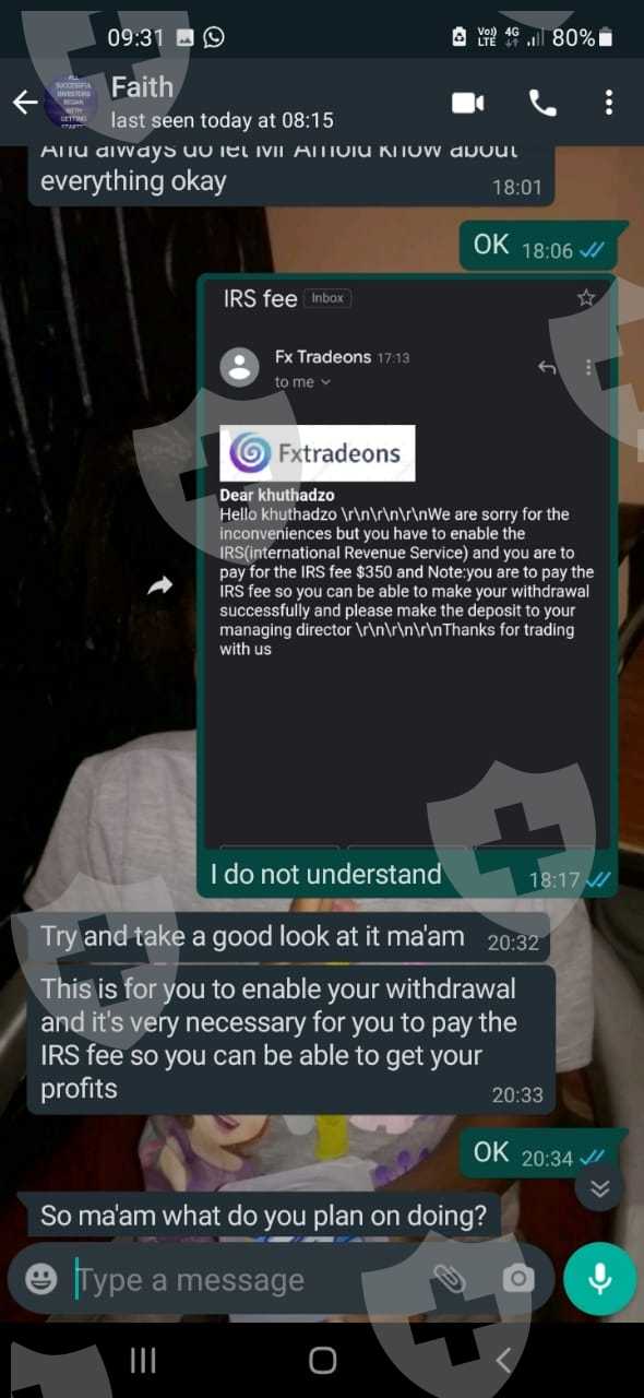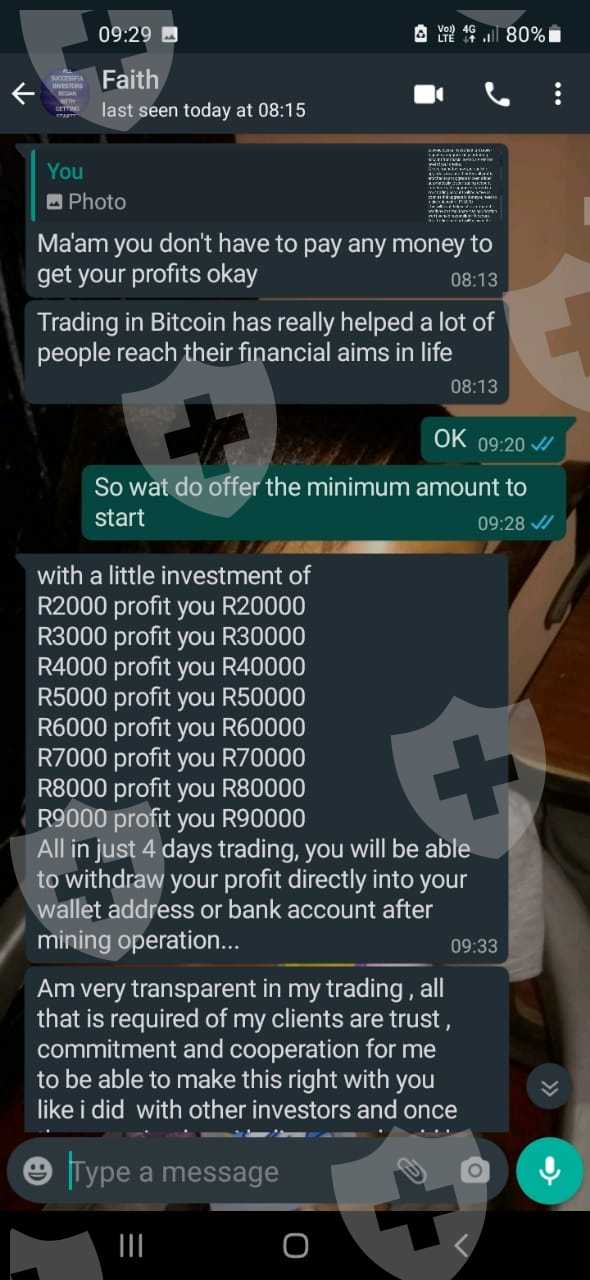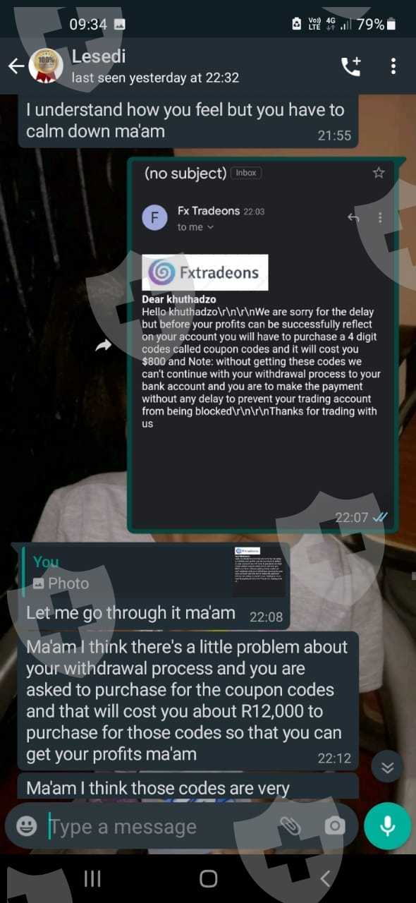 OK the scams told me that if I invest 2000 to get 20000 after 3 days without paying withdrawal I did invest my 2000 and after 3 days they send me an email saying I can't get MY profit I need to pay 5000 for withdrawal I did borrow they money and I pay that 5000 and they say they will get back to me after 3 days and I did receive an email again says I need to pay 8000 for withdrawal I did pay that money and after 3 they get back to me with an email says I should pay 12000 for the coupon codes.