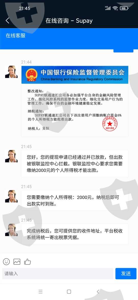 suPAY联通速汇诈骗公司,我第一次提现说我银行卡信息错误,让我交纳修改费,交了修改费,第二次提现说被银联监控拦截要纳两千税才可以到账这是骗子平台,不给我的钱到账,我还会投诉,还会到处曝光的