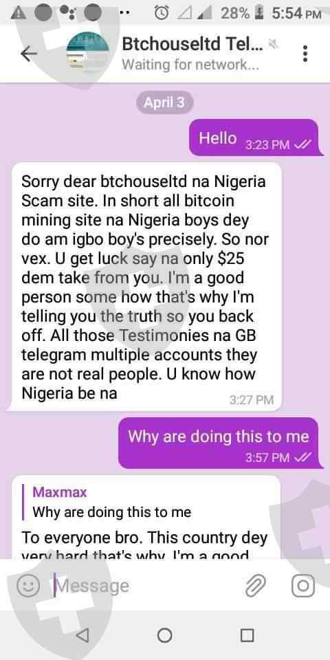 比特币挖矿是一个骗局。这个来自尼日利亚的伊博骗了我辛苦赚来的钱。