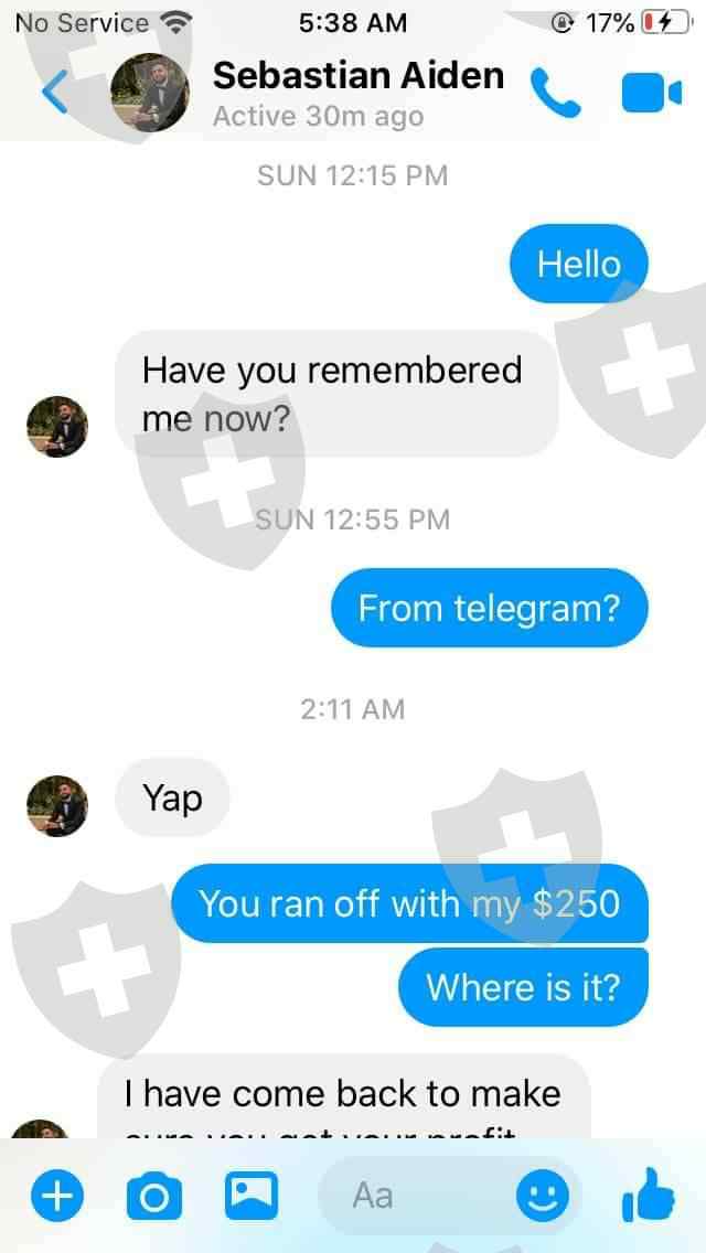 Telegram 频道中一个名叫 Sebestian Aiden 的人让我投资 250 美元(我向朋友借的),但在我发给他这笔比特币后就被屏蔽了。当然,我非常生气。我花了一个月的时间才缓过来。