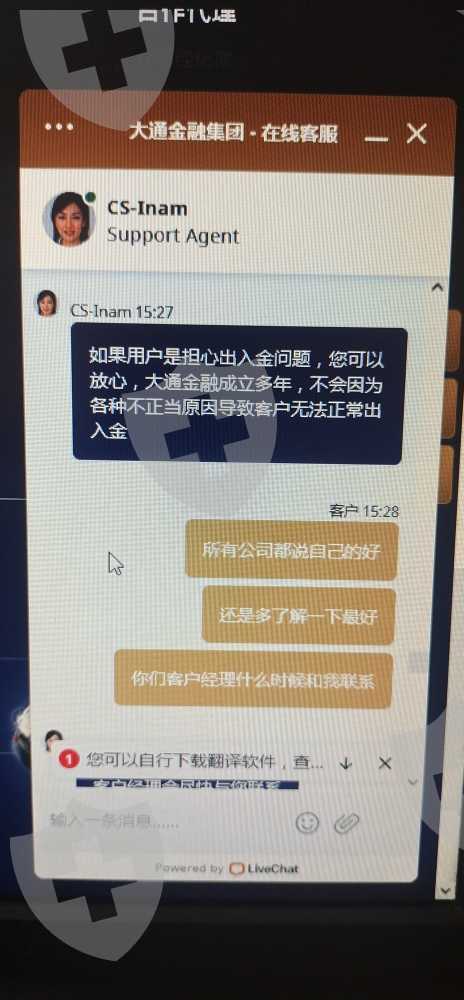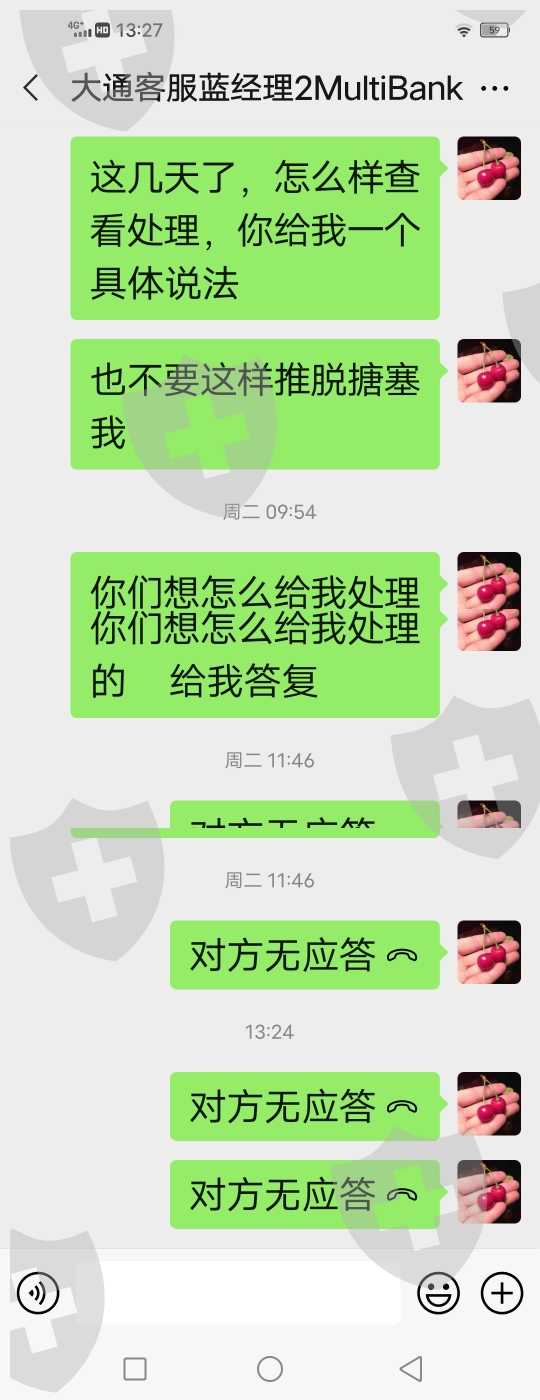 大通金融,几天无法入金导致客户爆仓!八月四号到现在,无人处理,都在逃避问题,推脱责任!客服承诺,开户保证出入金及时到账!