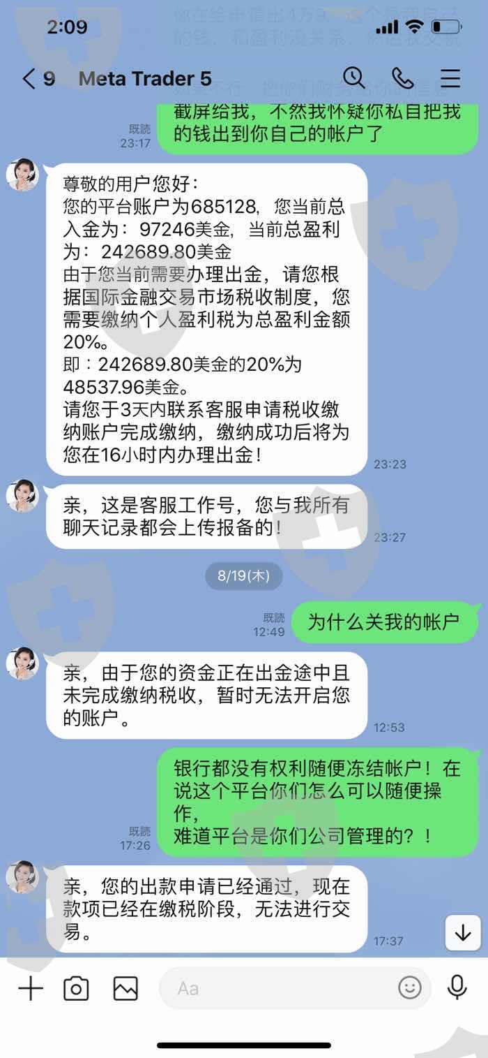 8月2号收到平台通知说我为按申请要求完成活动是违约行为。需要交易600手、15天后才能为我办理出金。8月16日我按要求完成600交易,再次要求出金。平台先是同意为我出金,需要1-3个工作日,但第二个工作日时突然对我说要我补交盈利税务后才能给我出金,并冻结了我的MY5帐号。