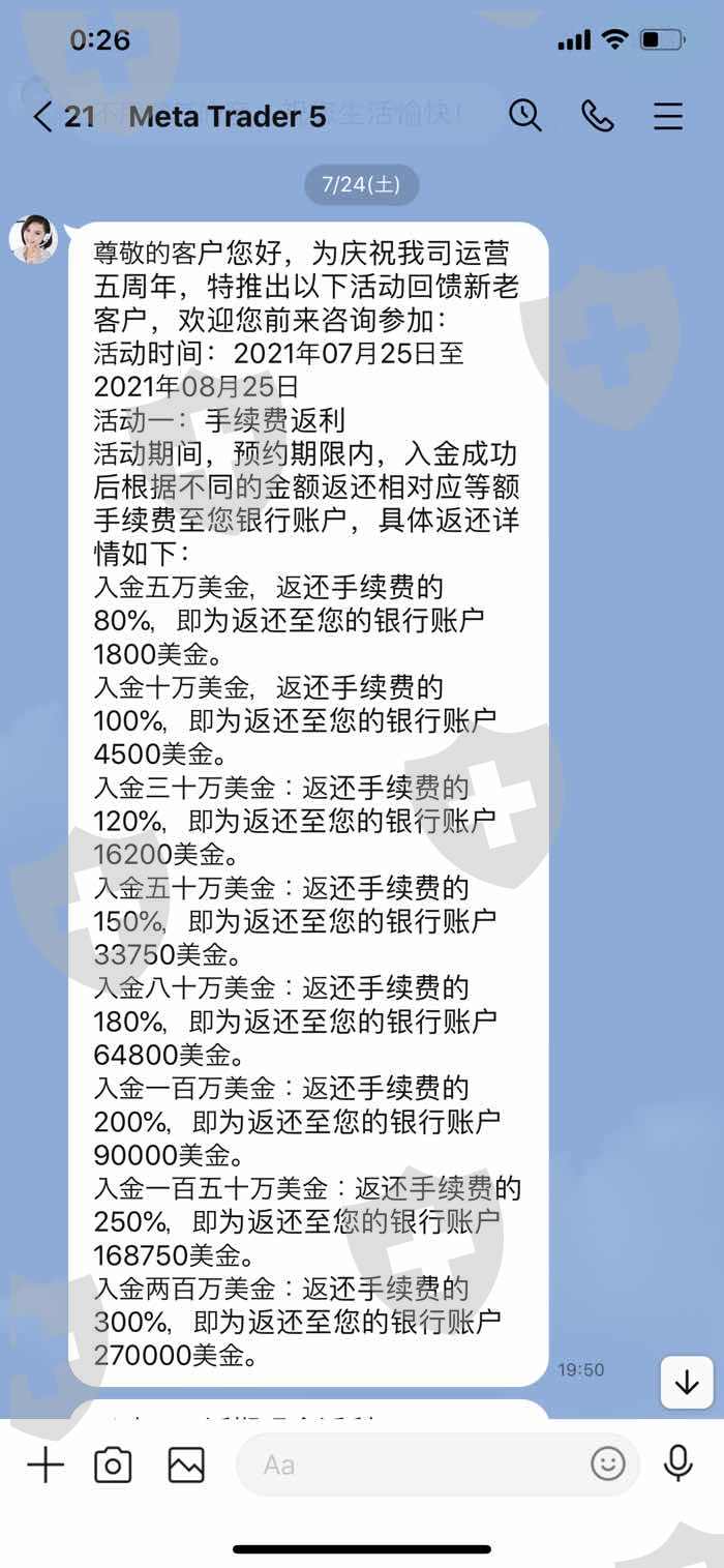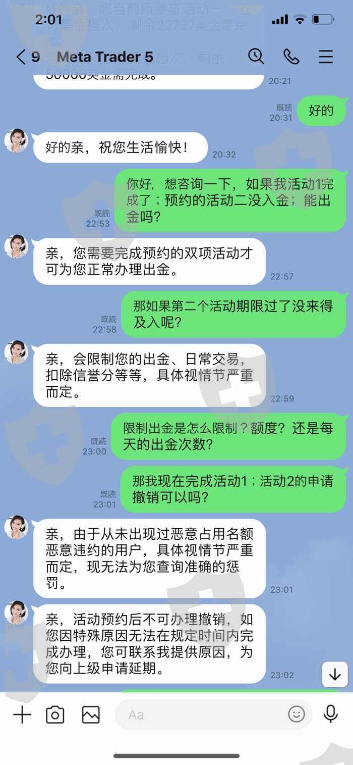 7月24日平台发来活动信息,在网友的劝说下申请了公司的两个返现活动;但再次入金18万之后发现平台存在违法行为后停止入金,拒绝参加活动,并要求平台出金。但平台以申请返现活动期间为理由限制出金。期间多次和平台客服沟通要求撤销申请活动,并要求平台出示具体活动条款说明。但平台一直以我申请了就是签订合同为理由拒绝我的撤销申请,也一直没有拿出相关详细条款。
