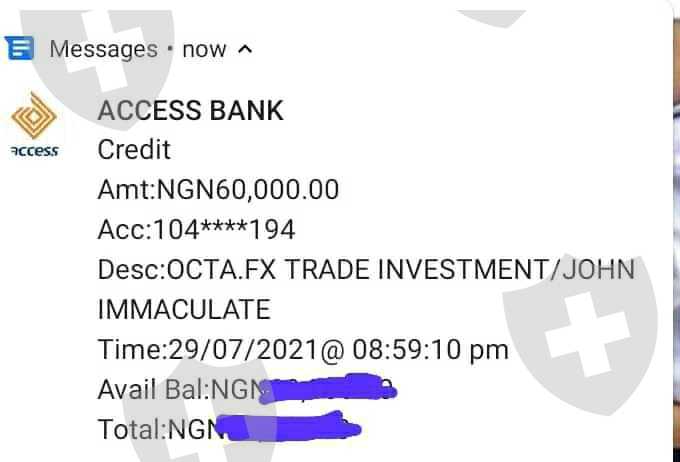 SOME ONE CHAT ME UP ON TELEGRAM CLAIMING TO BE AN OCTAFX AGENT HE ASK ME TO INVEST 30, 000 AND I WILL GET 60, 000 IN RETURN SO I AGREED AND TRUST HIM I BROW MONEY FROM MY ELDER BROTHER AND INVEST AFTER SOME MINUTES I SEND THE MONEY TO HIM FOR THE INVESTMENT PACKAGES LATER ON HE SEND ME AN FAKE ALERT OF 60,000 WHICH IS ON THE SCREENSHOT AND BLOCKED MY NUMBER SO PLEASE STAY AWAY.
