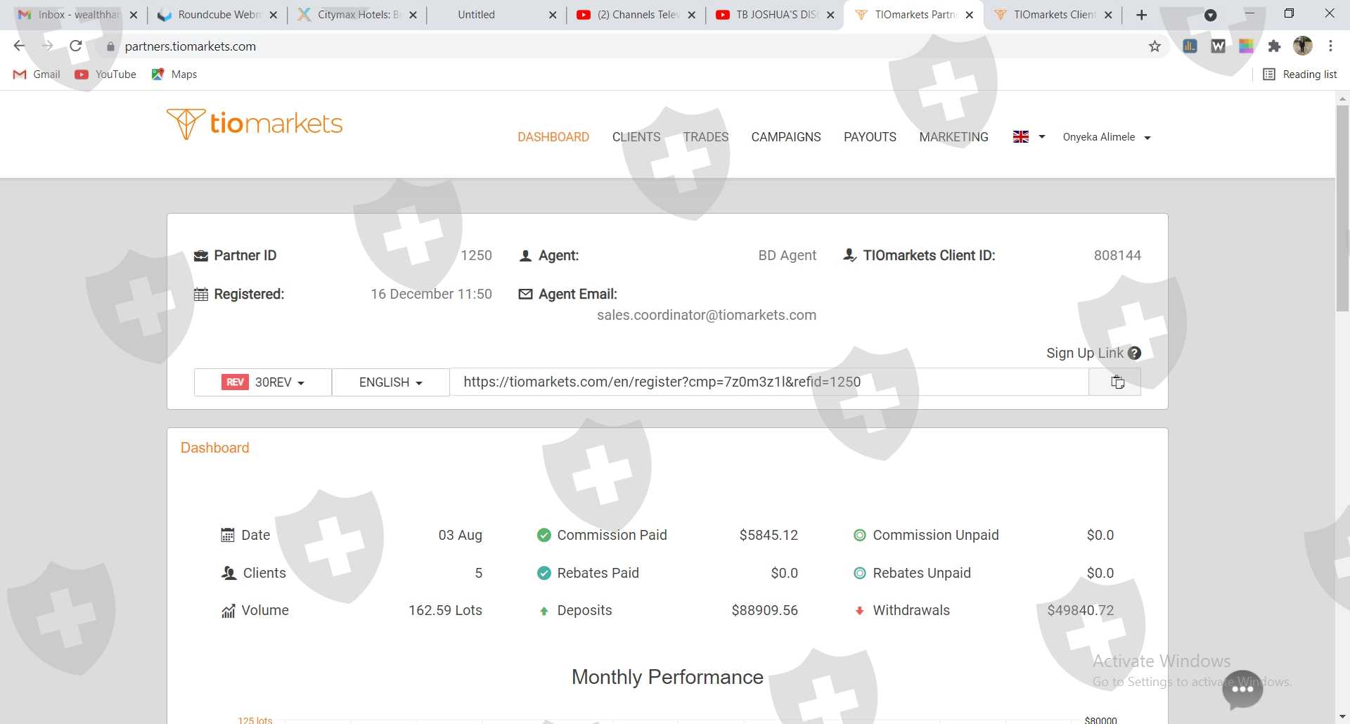 I have a rolling basis rev share deal of 30% with Tiomarkets and my IB commissions as at end of July 2020 as stated in my IB portal was 9,338.29 USD (minus swaps). I waited for 3 working days for the payment to be effected to my client portal so I can place a withdrawal of the money.
