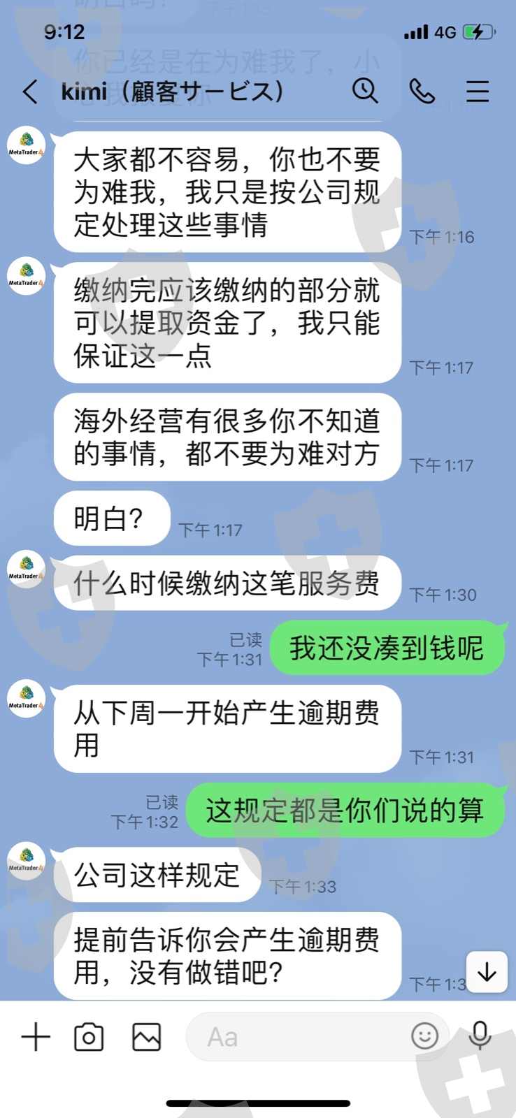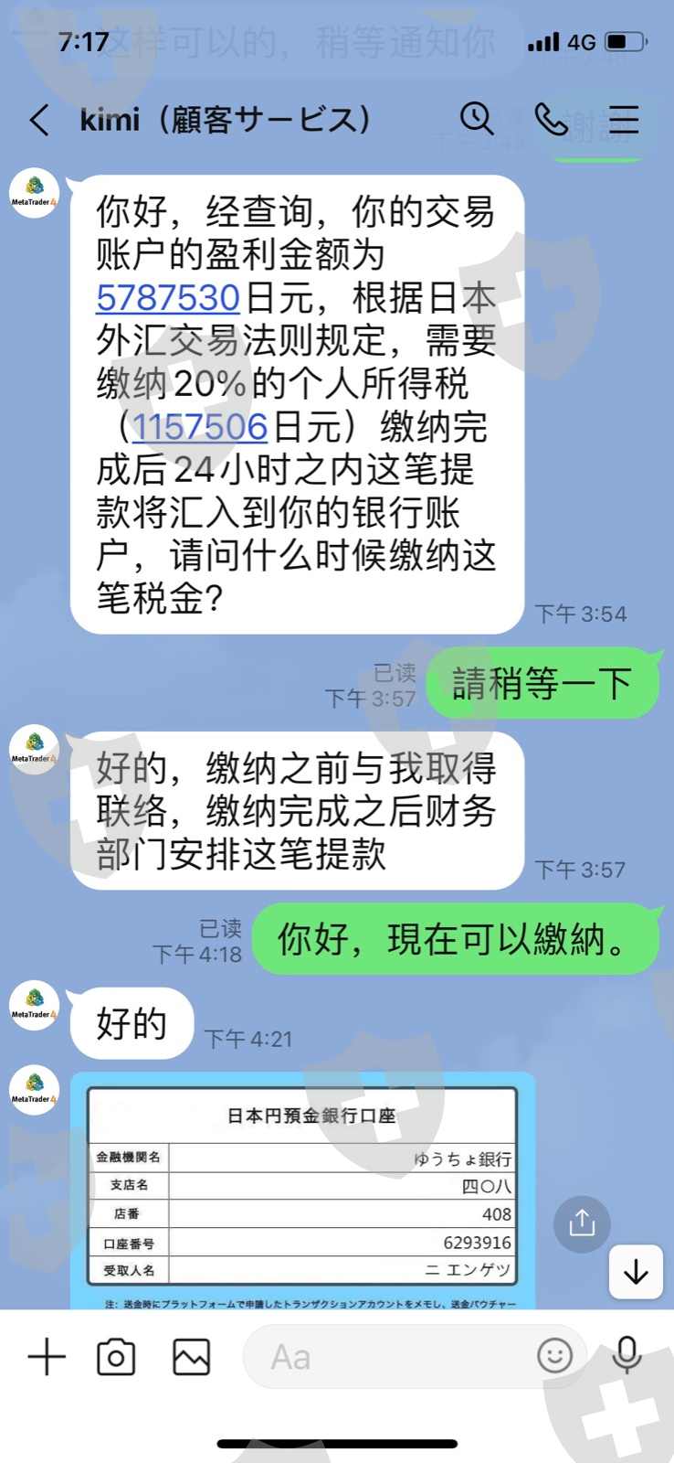 我在Lien认识女自称日本人介绍我炒外汇给我推荐一个LienMT4的客服,开户和充钱都是通过这个所谓的客服总共金额350万日元每天行情都是这个日本女的给我的,利润是500多万日元,我要提现这个网上输入金额确认提现没有反应,我感觉上当了找这个客服让交%20个人所得税交了24小时出金.24小时没有出金又让交%2服务费,我要曝光