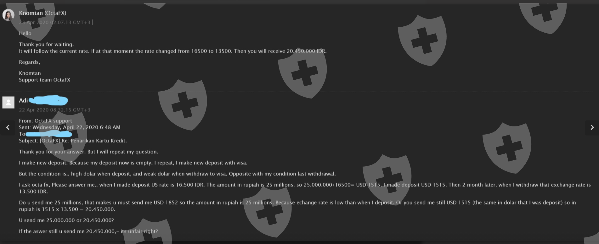 I withdrew the money in March of about 30,000 usd. by octafx, my funds are partially required to return to a credit card of 19,955.98 usd. I asked if I still can send it to my bank. but if that's the rule that must be done, I'm fine.so the rest is sent via bank transfer. and my money came in at the current exchange rate to my bank.but what really problem is what goes into my credit card. Other brokers use the current rate when returning to my credit card. from us dollar to IDR rupiah.but octa fx uses the exchange rate when I make a deposit. where the rate is lower when sending to a credit card time. deposit in late january and early february. so if using the exchange rate at that time (march), I did not receive USD 19,955.98. but rather around USD 19,000. because of the difference in the current exchange rate and the time of deposit.