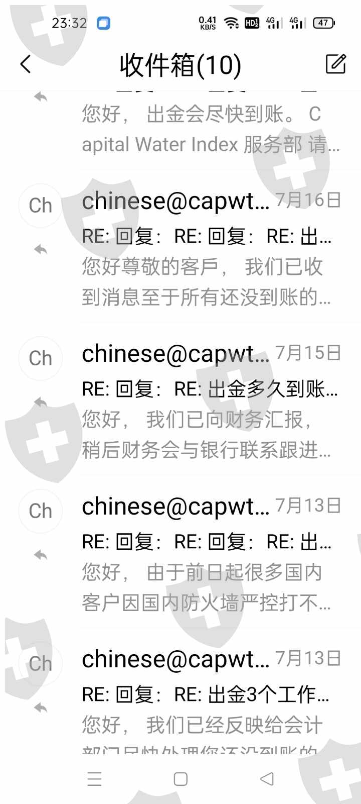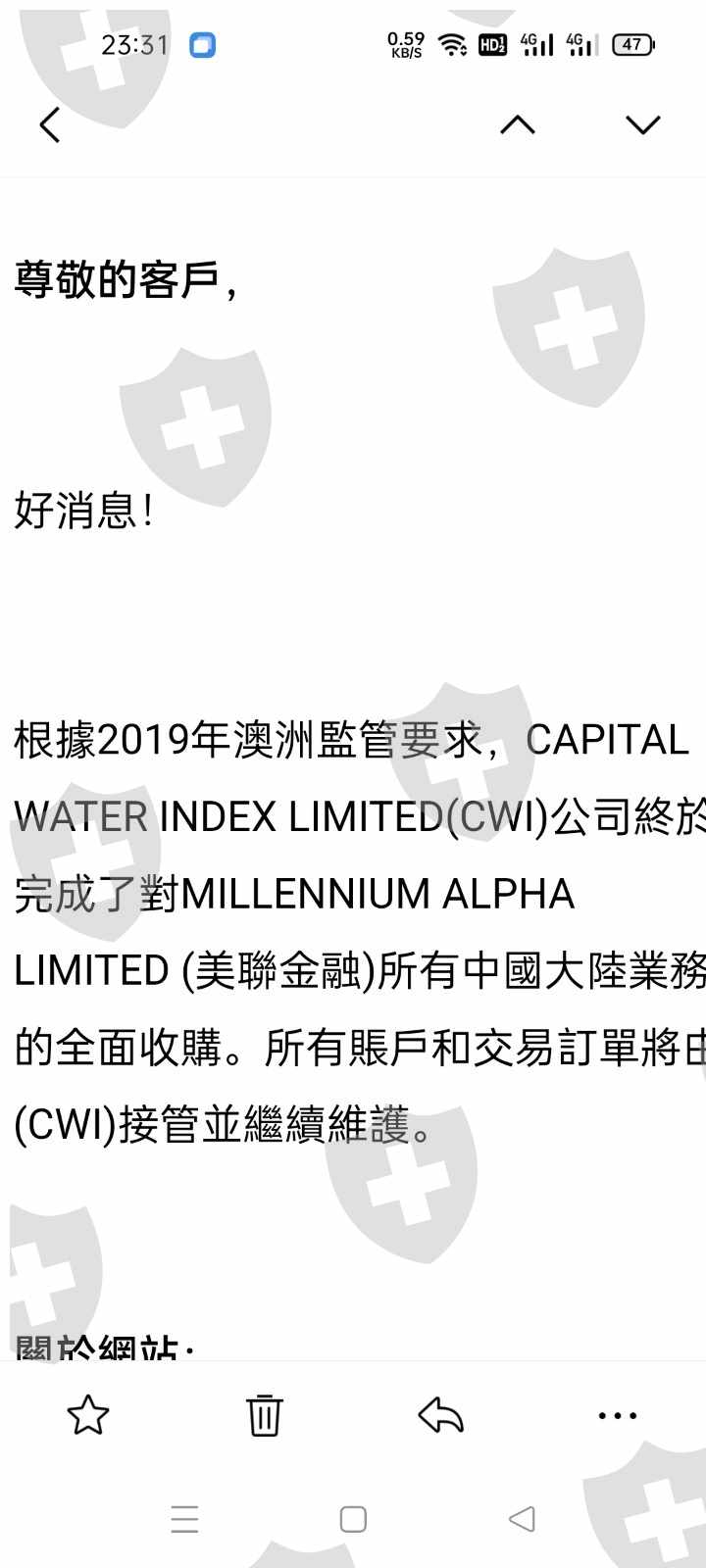 之前在美联金融入金,后来收到邮件说是美联金融在大陆的业务被CapitalWaterIndex收购了,我也是就出金,现在出金还没到账,都已经一个多月了。客服之前敷衍,现在都不回邮件了。