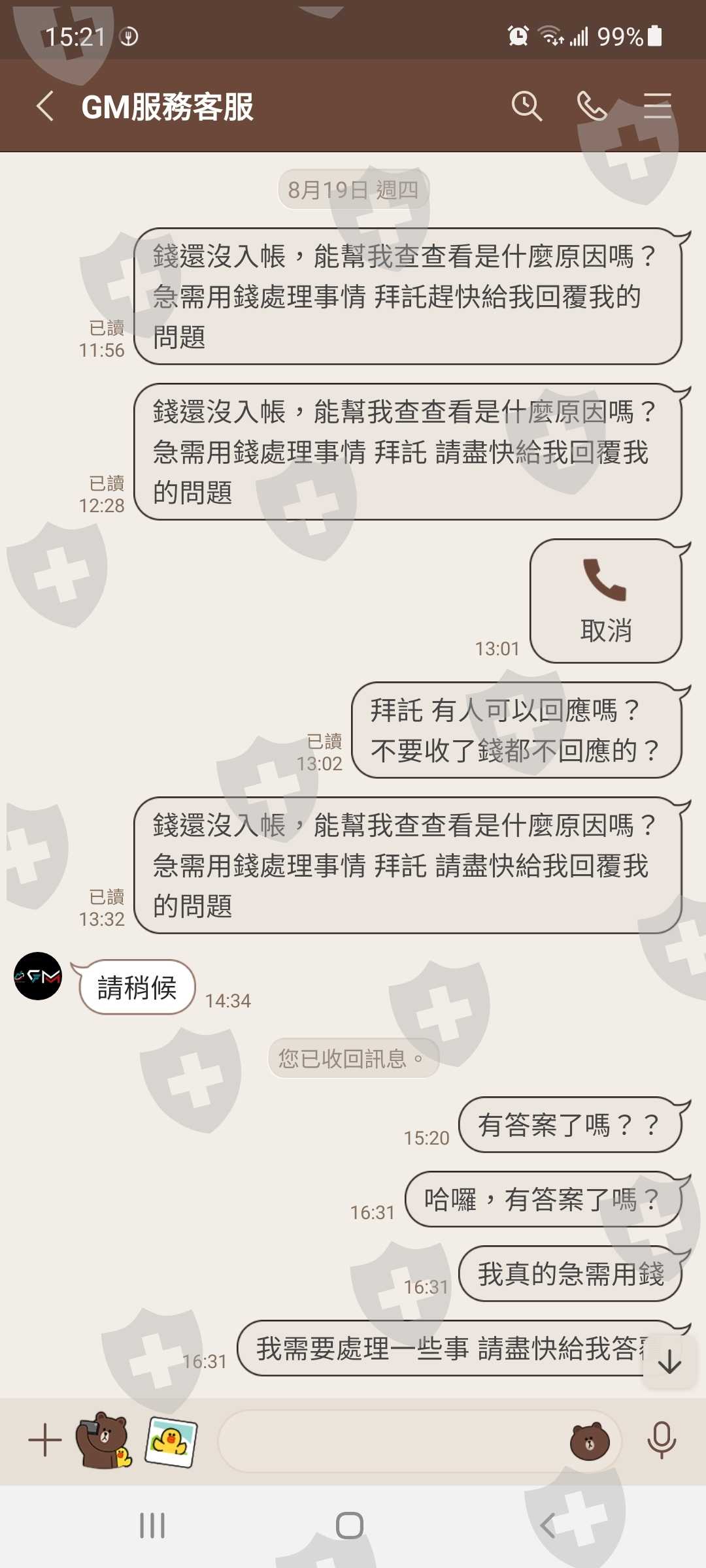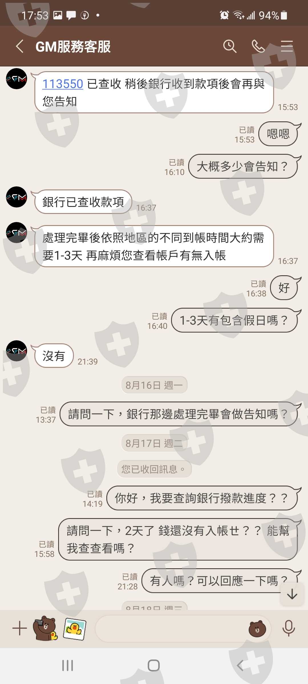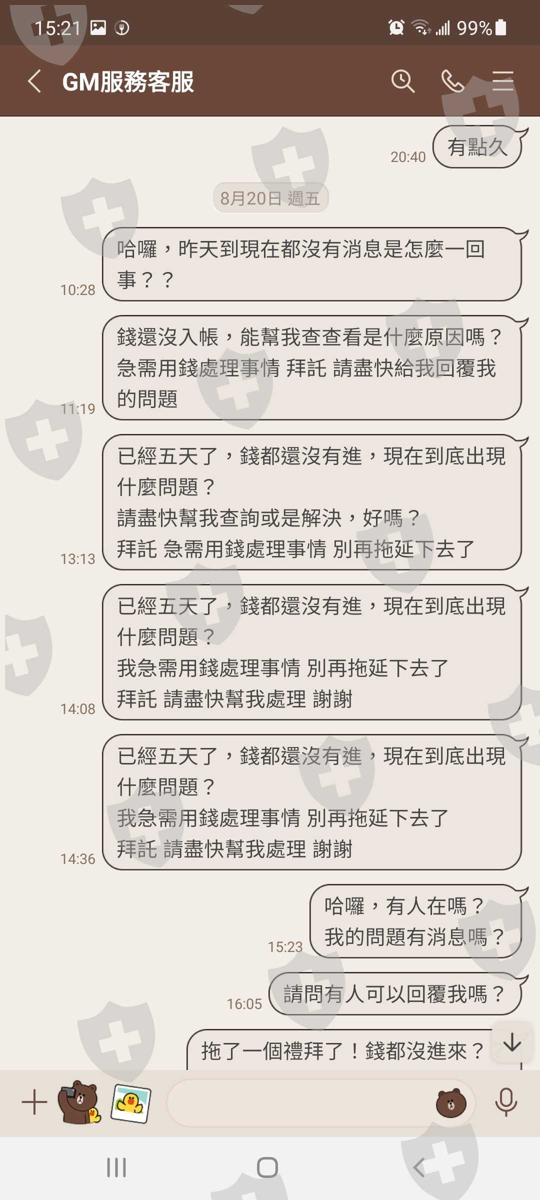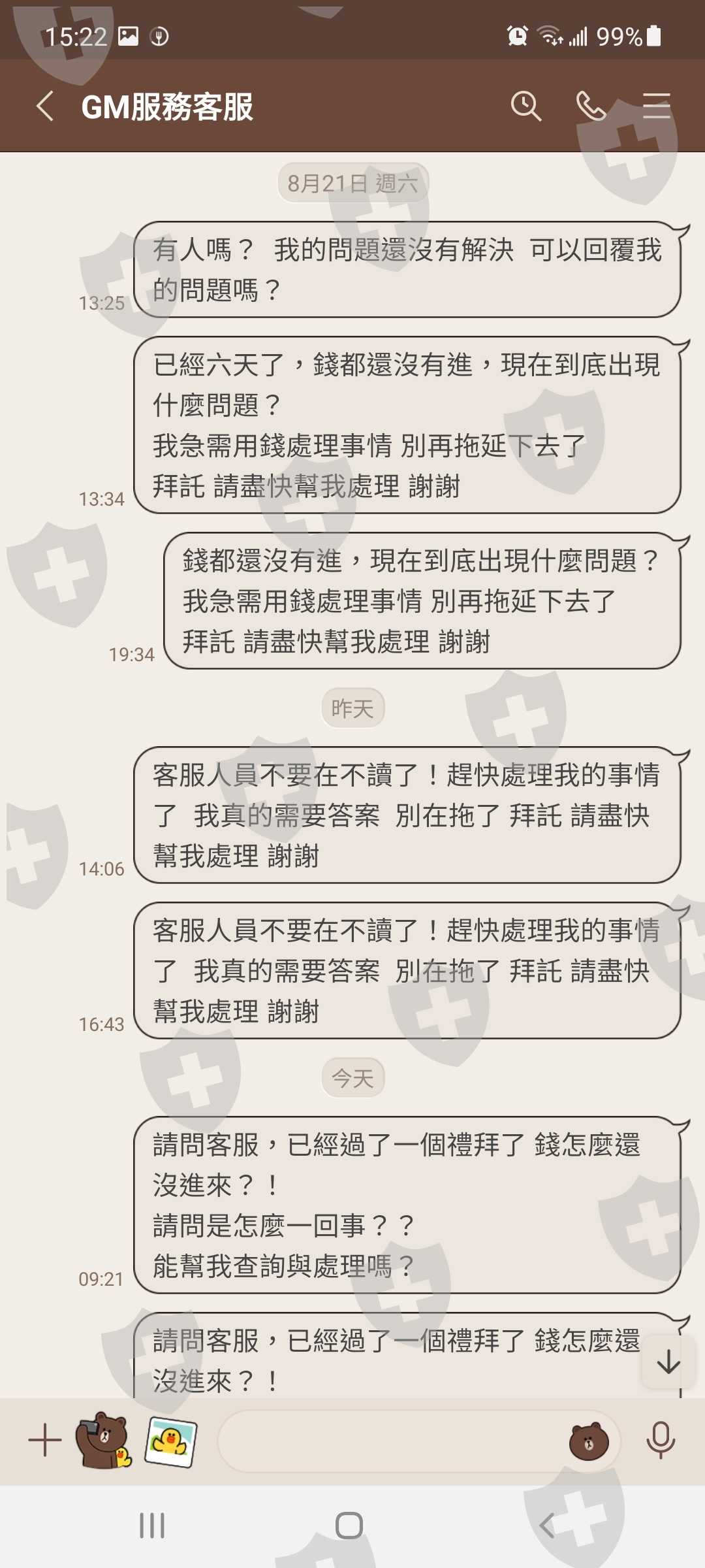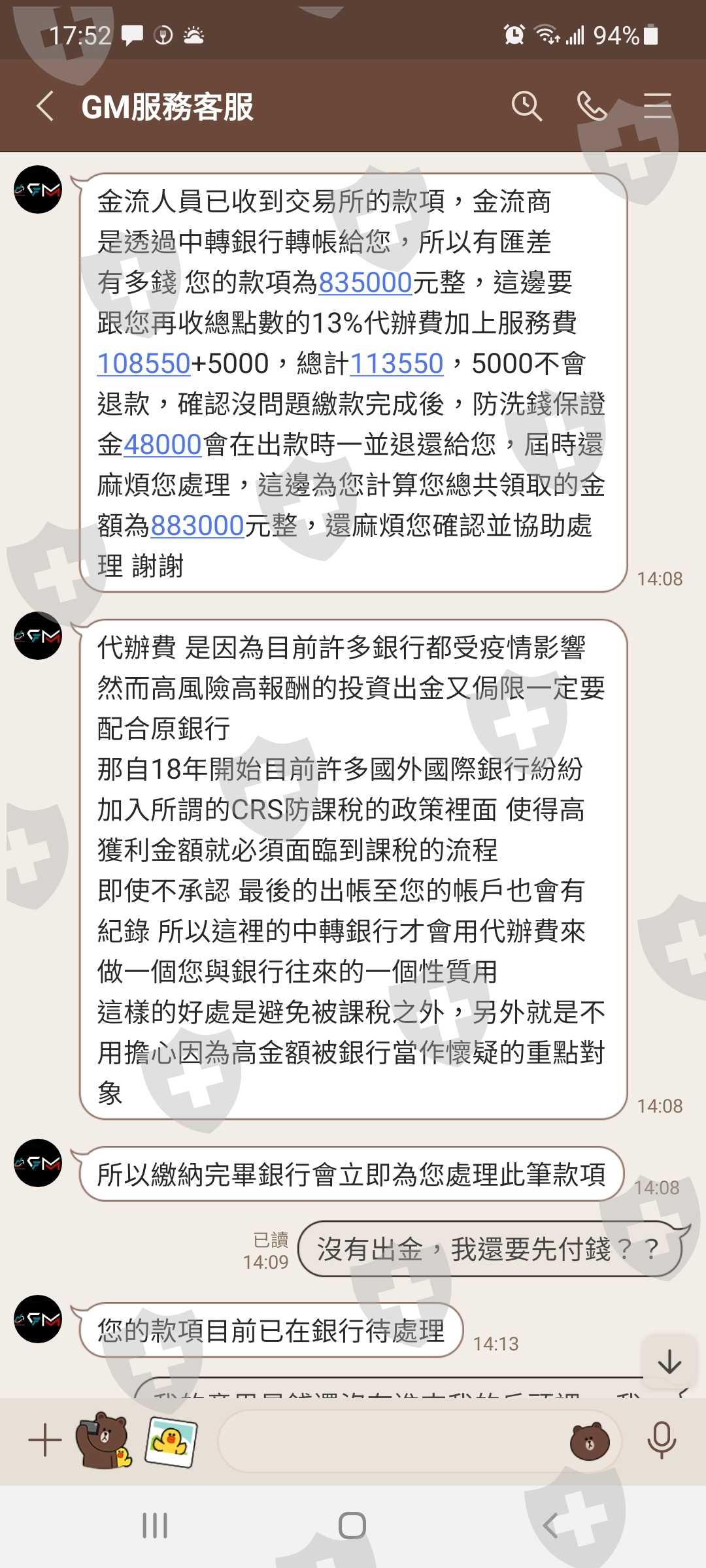 GFMM這個平台 本人在名叫懷宇的人帶領做操作 正常交易完了,要到出金的部分時,客服說要繳代辦費+服務費,要繳高額費用才能後續動作,本人繳完之後依然還是無法正常出金 ,本人已經等客服回應已經有一個禮拜多了,客服依然不回應也不處理。我還有詢問帶我的人是否會正常出金,他說不用擔心保證會下來,但是結果沒有下來,這擺明就是詐騙 請小心別在受騙上當了