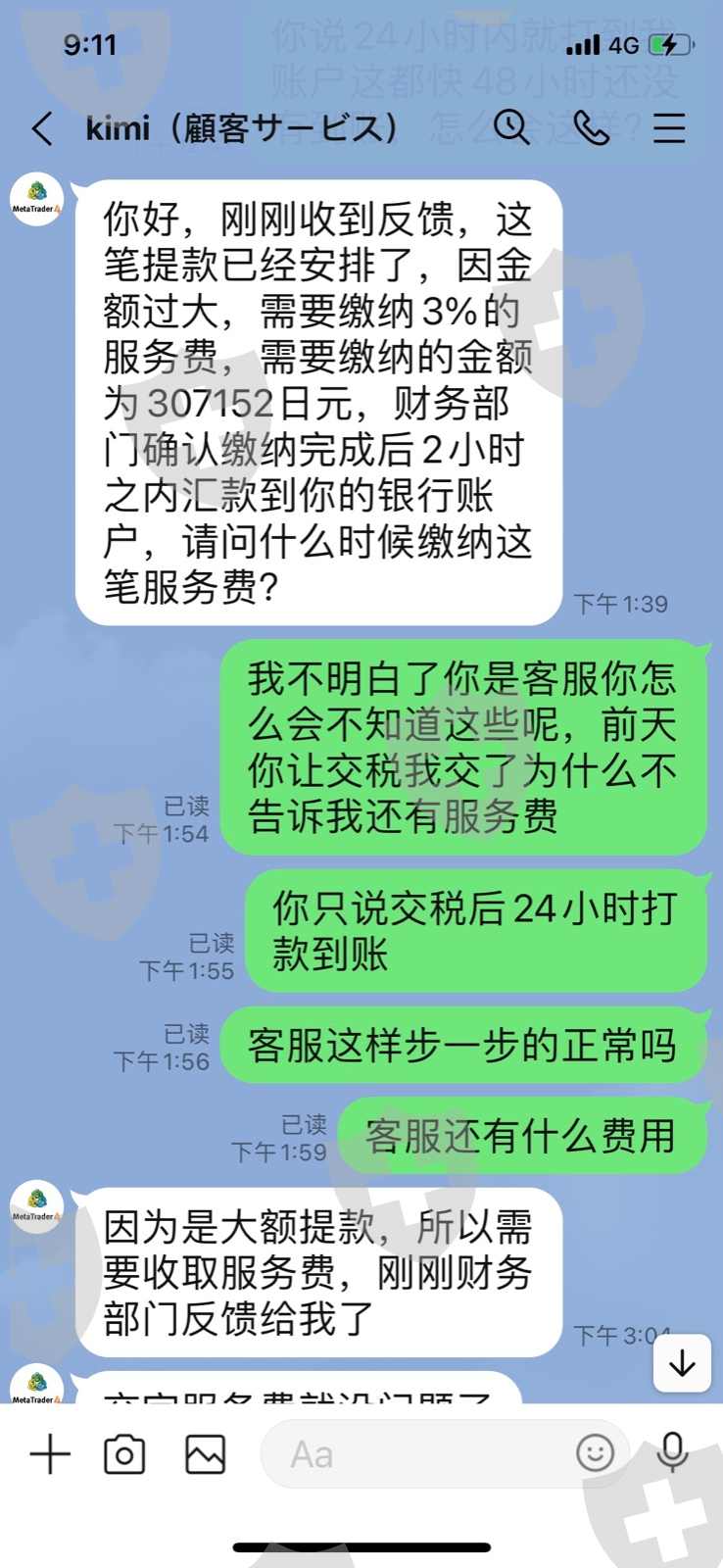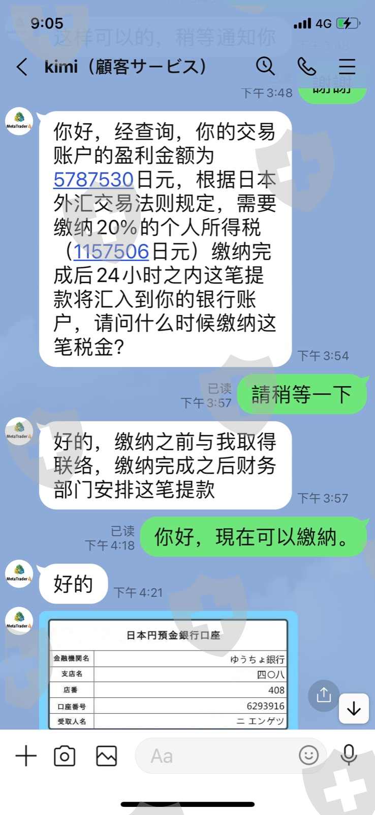 我的账户共93580美金,我在bebor平台网站提现确没有显示,LIEN MT4客服说盈利金额5787530日元应交个人所得税20%.24小时把资金转账给我交完税24小时没有出款又让我交2%服务费2小时出款,这是个骗局。