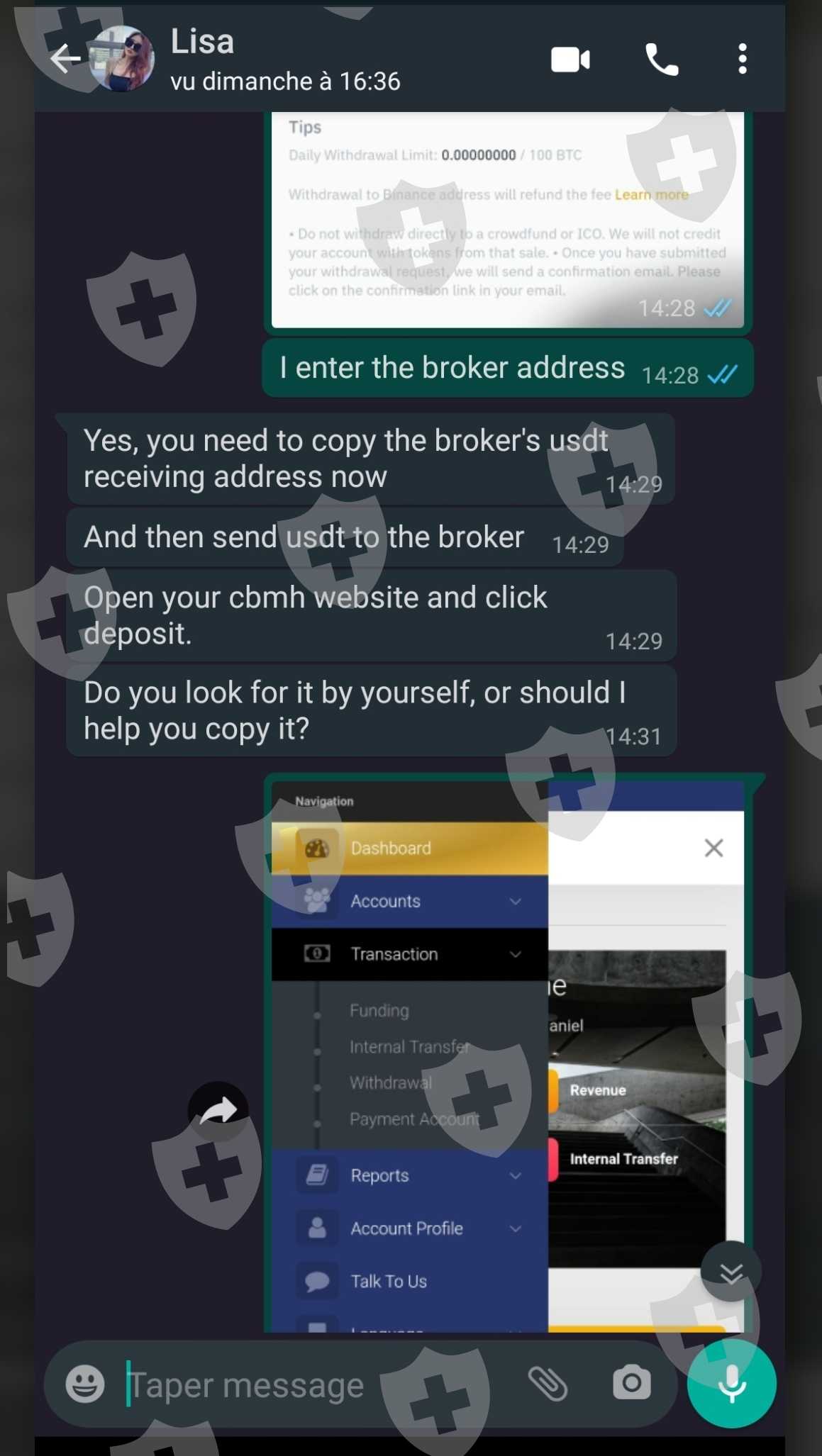 我是一个法国人,在这里发帖时因为我被一个叫的CBMH LIMITED中国交易商骗了。我在 Facebook 上遇到的一个叫丽莎的中国女孩,介绍我通过该交易商投资黄金。