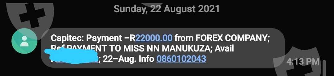 Instagram上叫 Lesiba 的人自称是外汇交易员的人邀请我投资,我很需要钱,他说如果我投资 1000 它会成倍增加,我告诉他我手上有 200 兰特,他说能赚回 2100 ,我很高兴就入金了 200 兰特,我问在此之后是否要付款,他说必须再存 500 才能升级。
