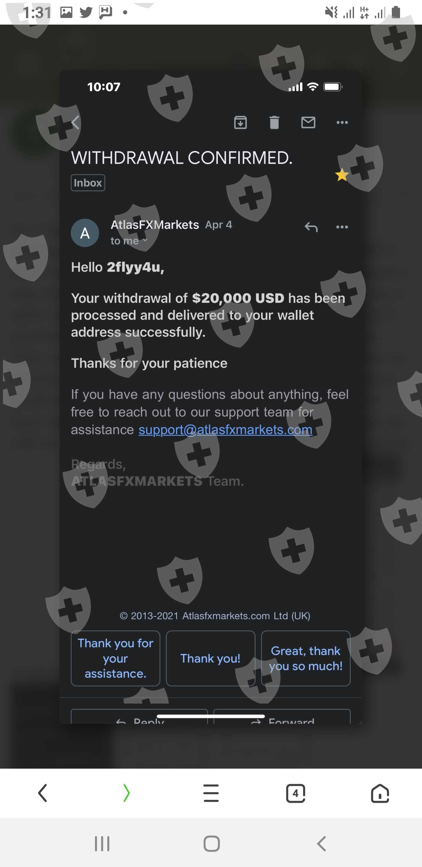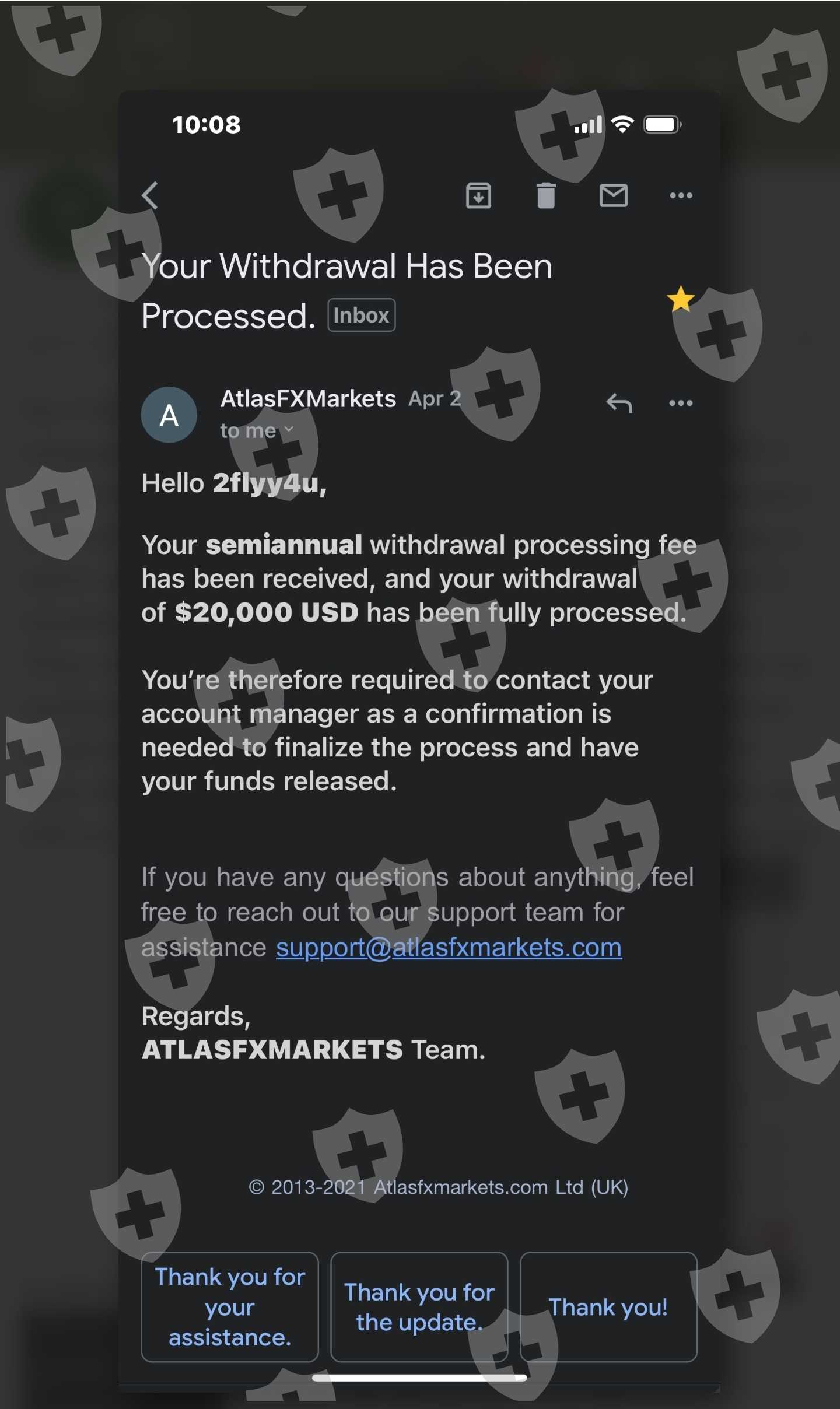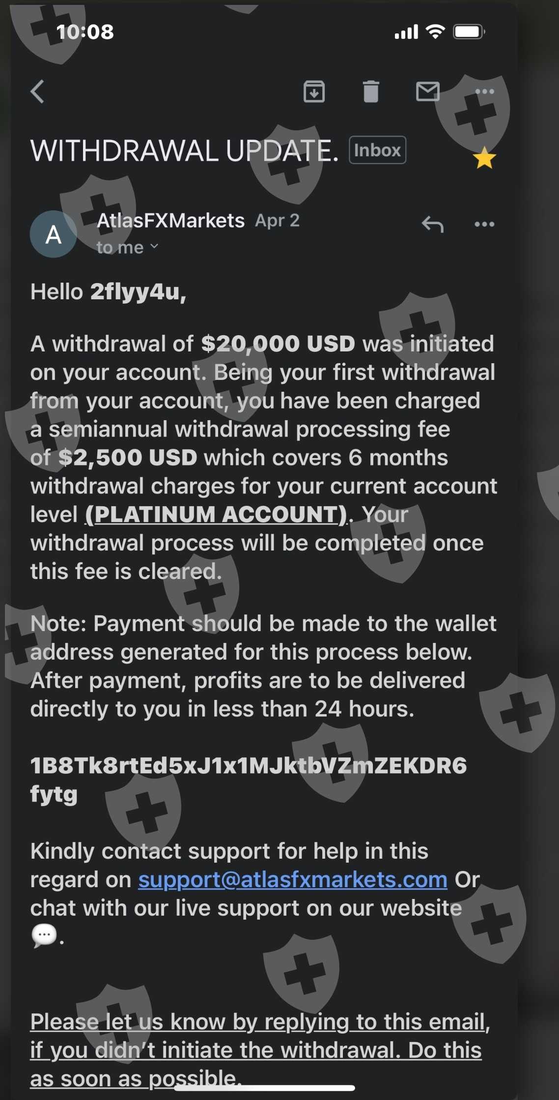 我在这家公司有一个账户(Atlas fxmarkets.com;许可证号:17901),赚了很多(25,710),到了付款的时候,我通过电子邮件收到通知Atlas必须支付半年的经纪费,以支付我接下来 6 个月的提款费用,费用是2,500。我付了之后得知还有 15% 的佣金。在他确认所有付款都已发送后,我收到一封电子邮件,告诉我资金正在释放。