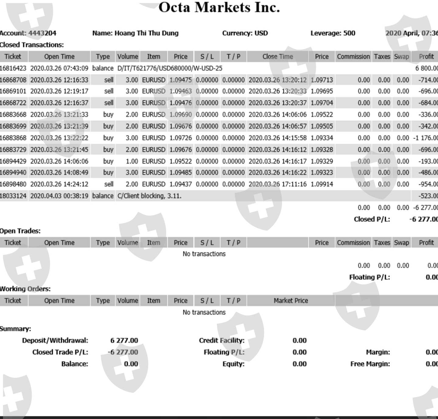 On March 27,Octafx blocked my account, deleted all my delivery history and all my customers did not have email