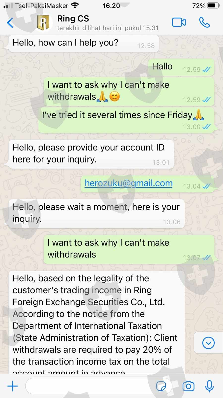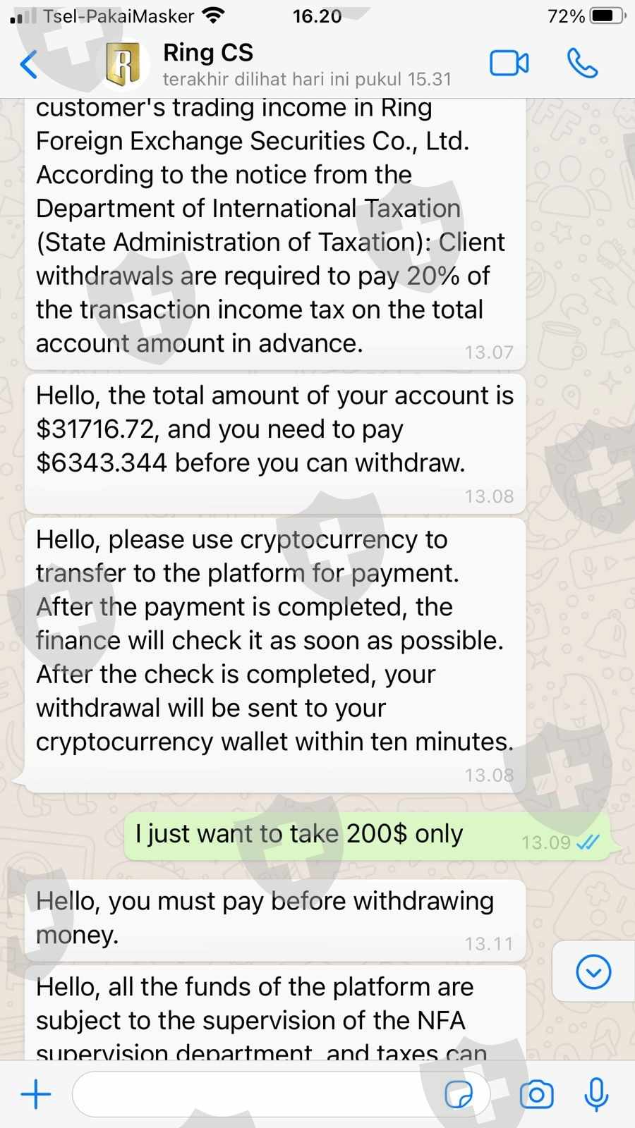 Awal nya saya berkenalan dengan perempuan yang mengaku bernama kelly di tinder, saya diajak bergabung di Ring Financial limited, setelah berjalan saya berhasil widhdrawl sebanyak 200$, setelah mau melakukan widhdrawal lagi saya di haruskan membayar pajak 20% dari hasil treding saya, samapai saat ini hasil treding saya tidak bisa di cairkan kalau tidak membayar pajak 20%. saya yakin dengan membayar 20% pajak dari treding saya maka saya akan mengalami kerugian semakin besar. kalau mau ambil 20% dari hasil treding atau ambil semua keuntungan kembali saja modal nya
