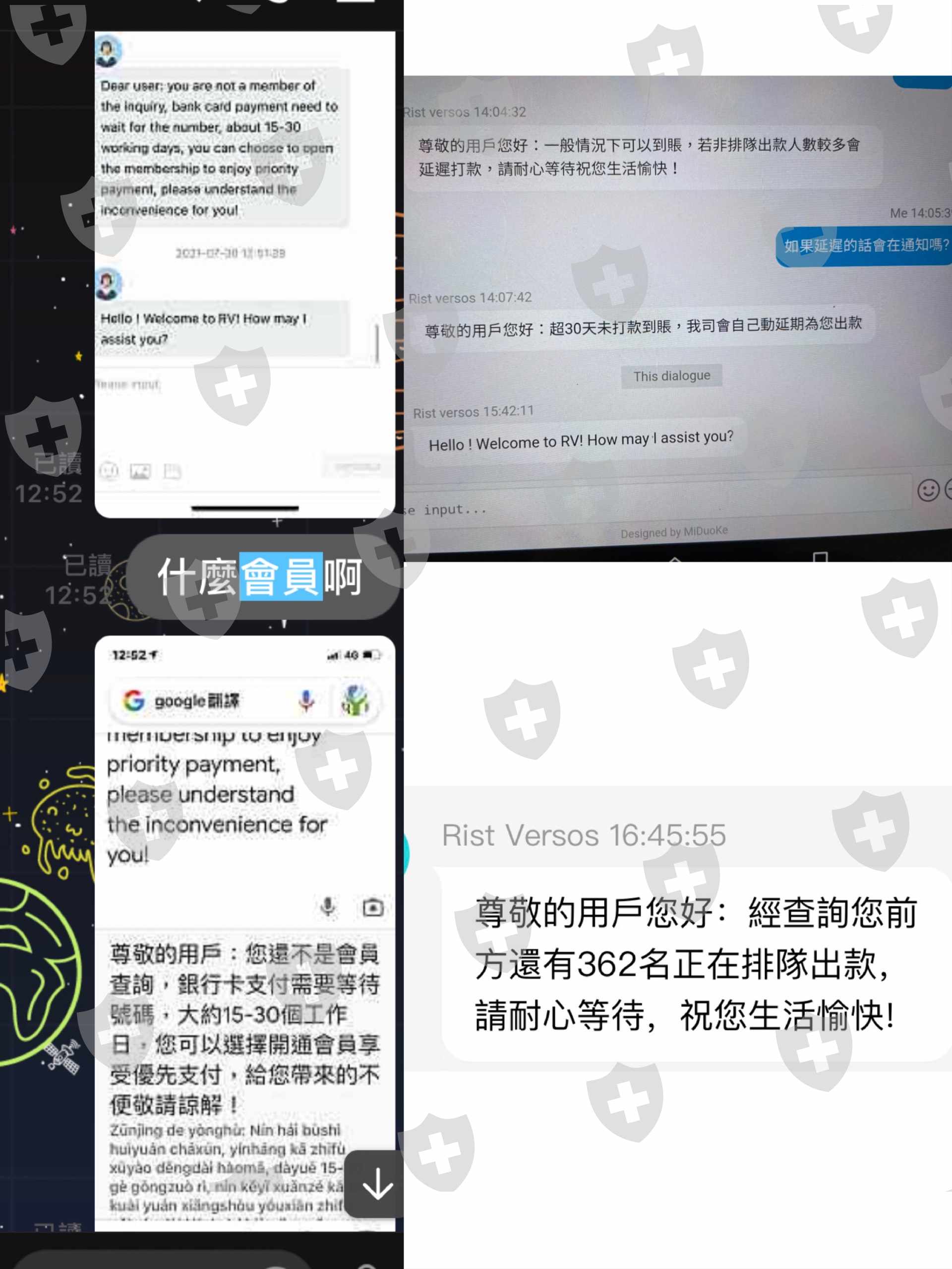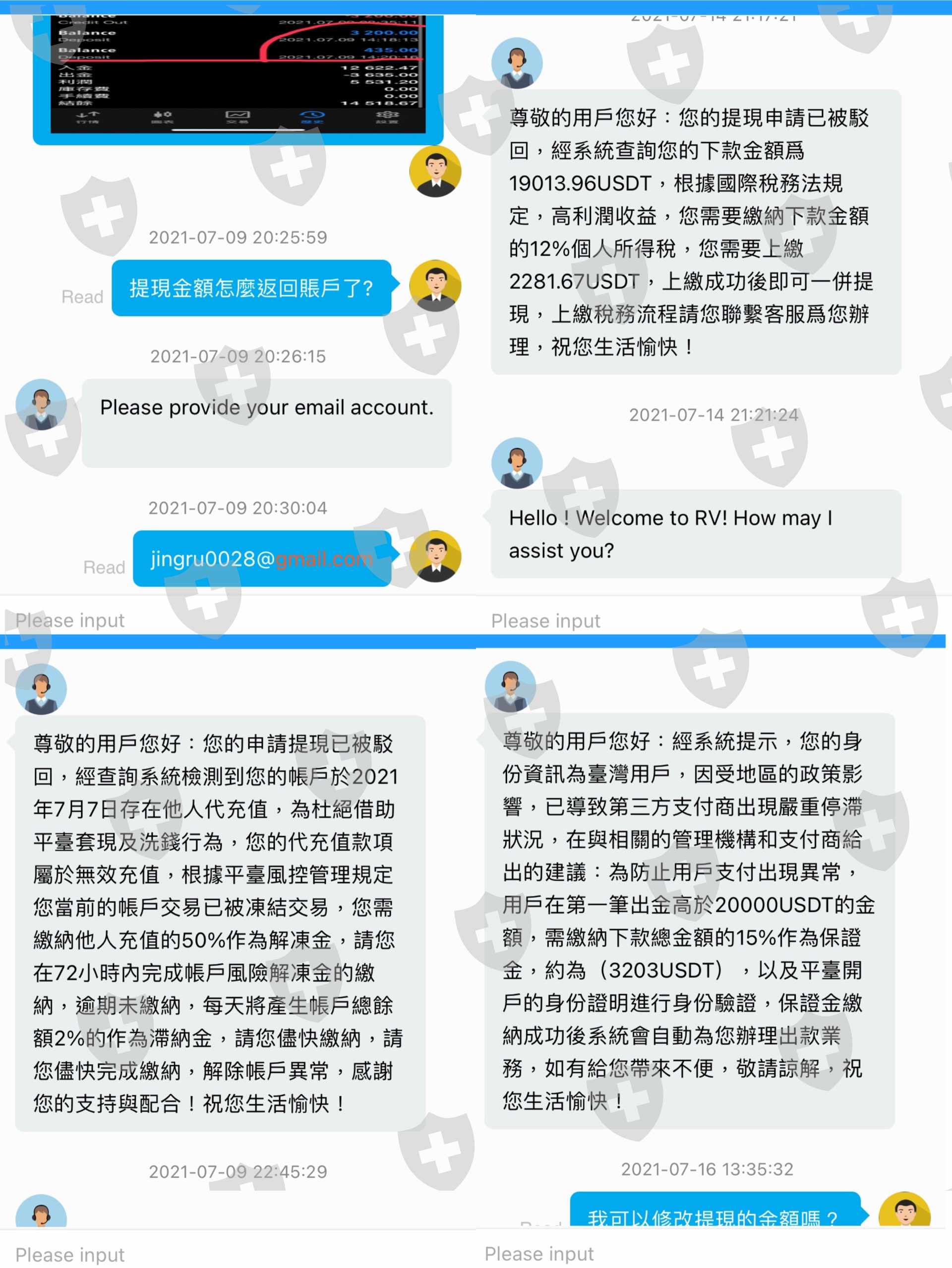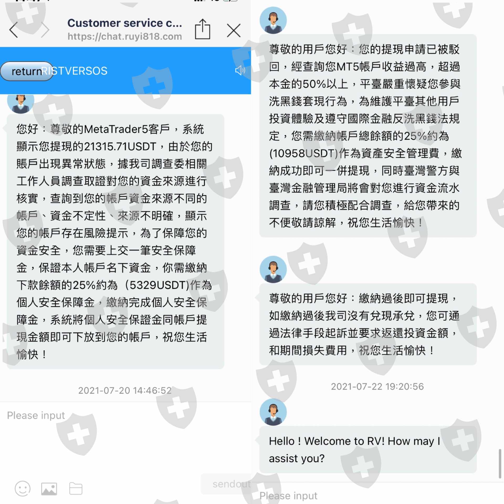 7/1開始在mt5投資rist versos,中間就被已帳戶不穩定、高利潤要繳稅、地域問題、又被懷疑洗錢種種理由繳了各種費用!在所有費用繳完後,7/27提出出金申請客服告知沒有充值會員需等待15-30天!並強調會員可以加數打款!會員需要近10萬元台幣!因為不想在投任何錢,所有等15-30的出款日!至今已超過30天,詢問客服客服總是告知排隊打款的人多要我耐心等候!