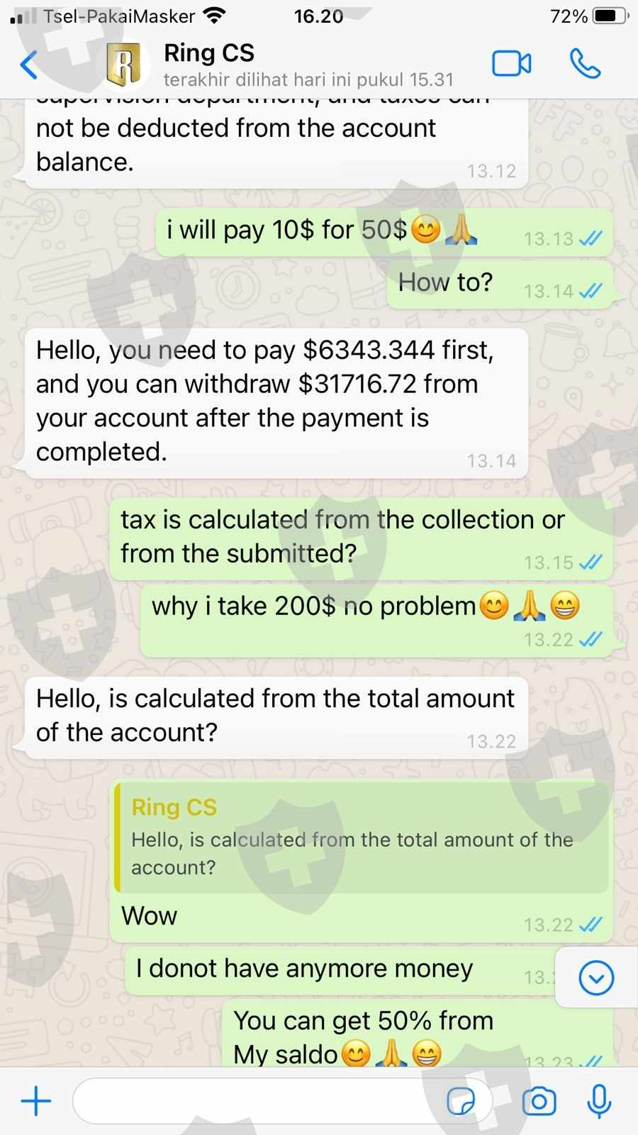 pihak ring financial limited meminta 20% dengan alasan pajak dan harus saya bayar di awal, ini tidak wajar karena hal yang aneh untuk sebuah transaksi di forex atau saham