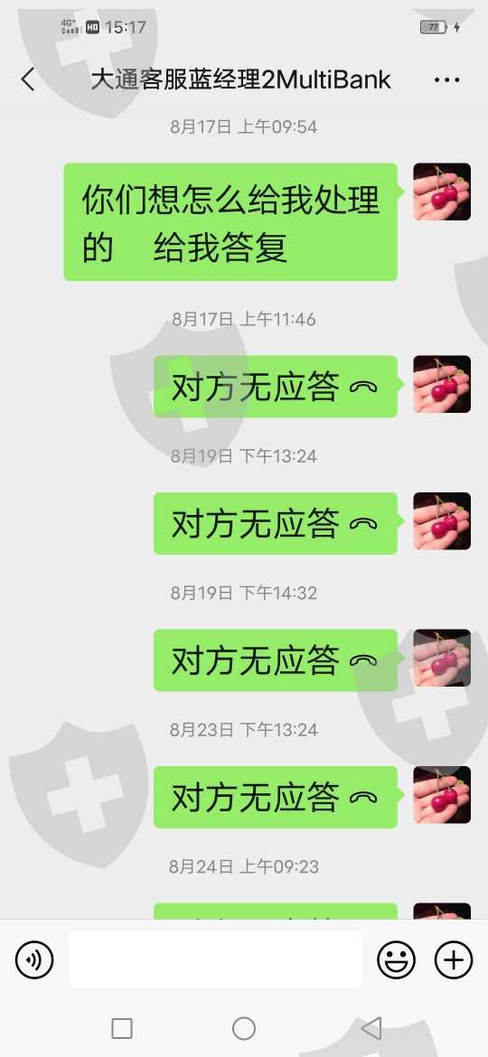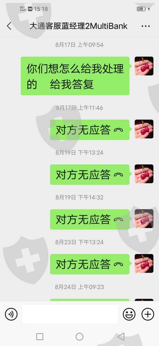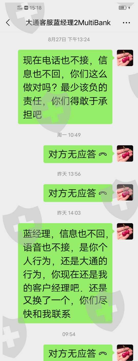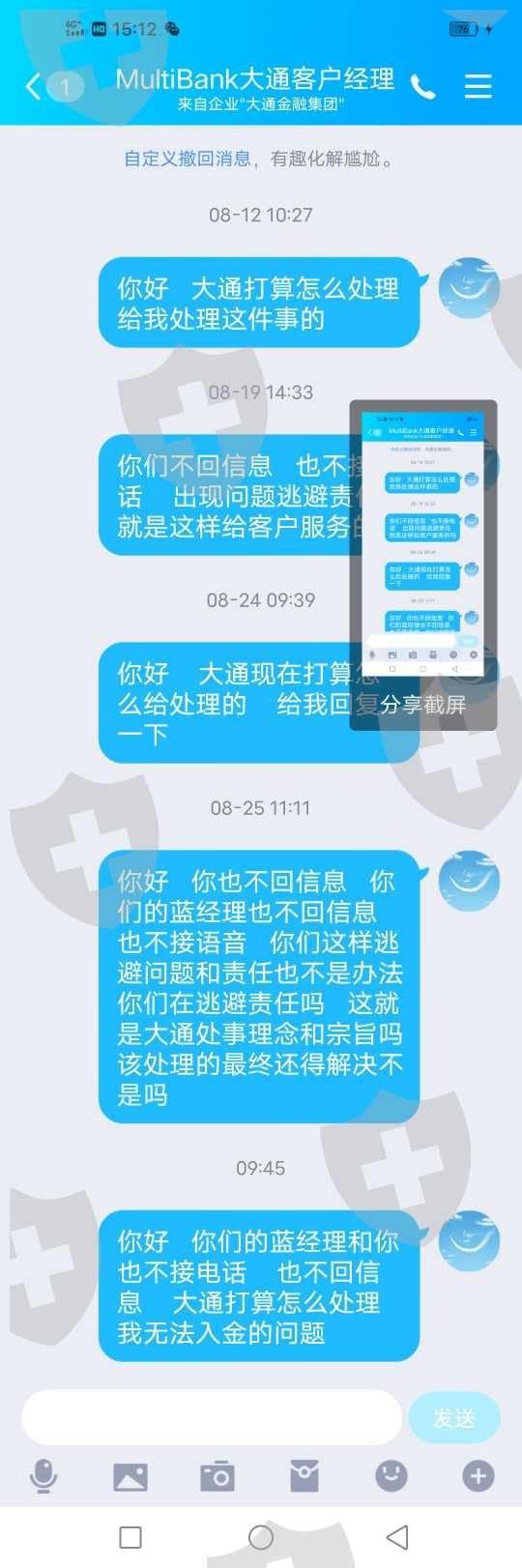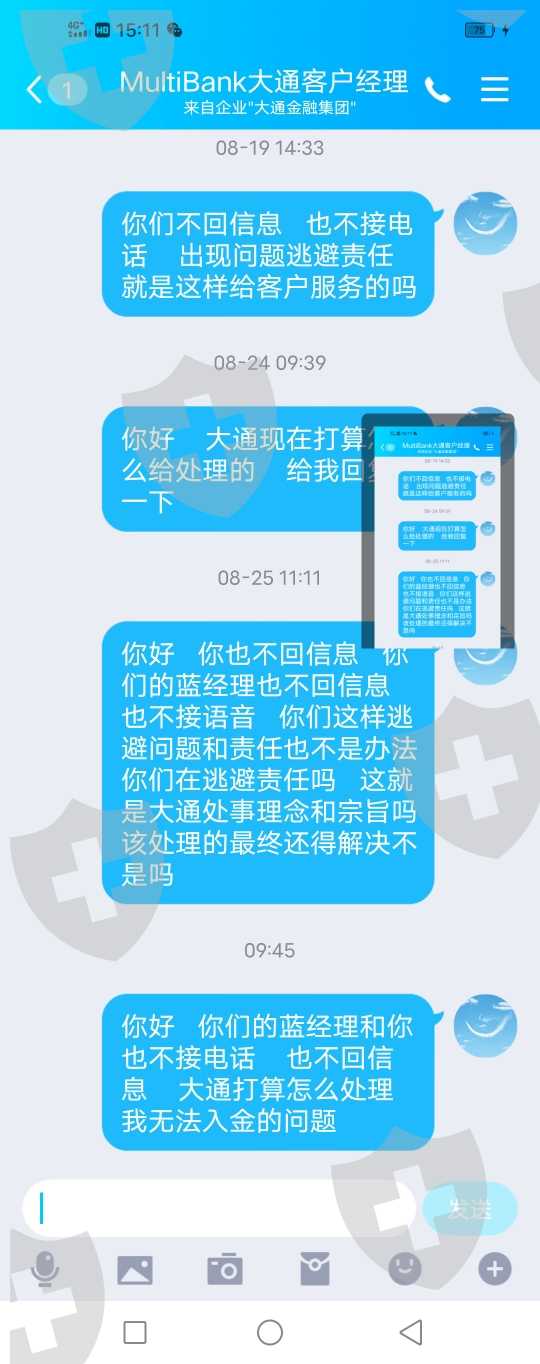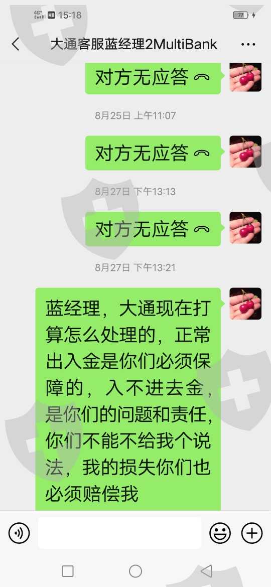 大通金融,几天时间无法入金,八月九号让我爆仓了,现在大通和客户蓝经理,也不接电话,也不回信息,也不给处理意见,强烈要求大通给我道歉,并赔偿我的损失!