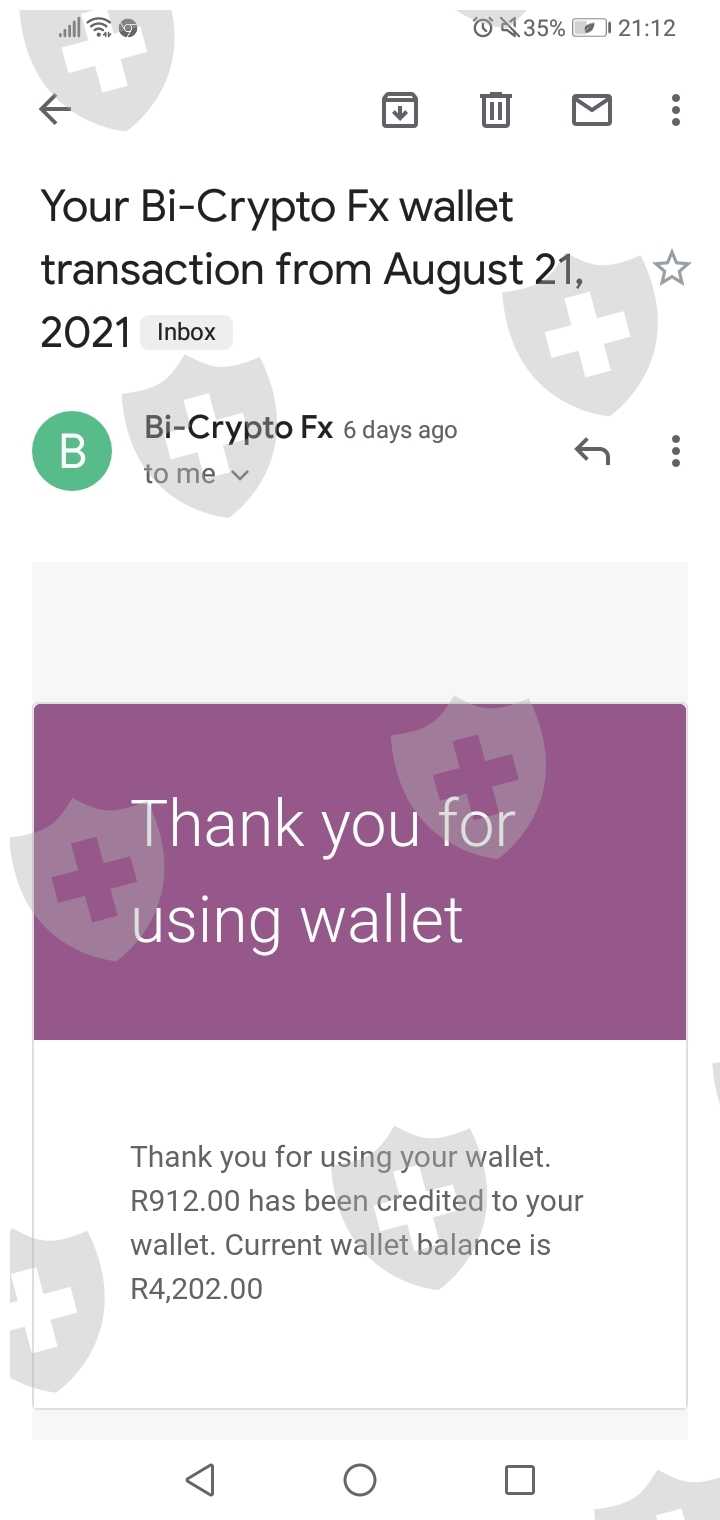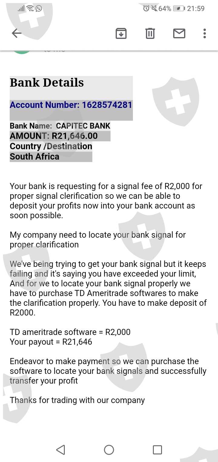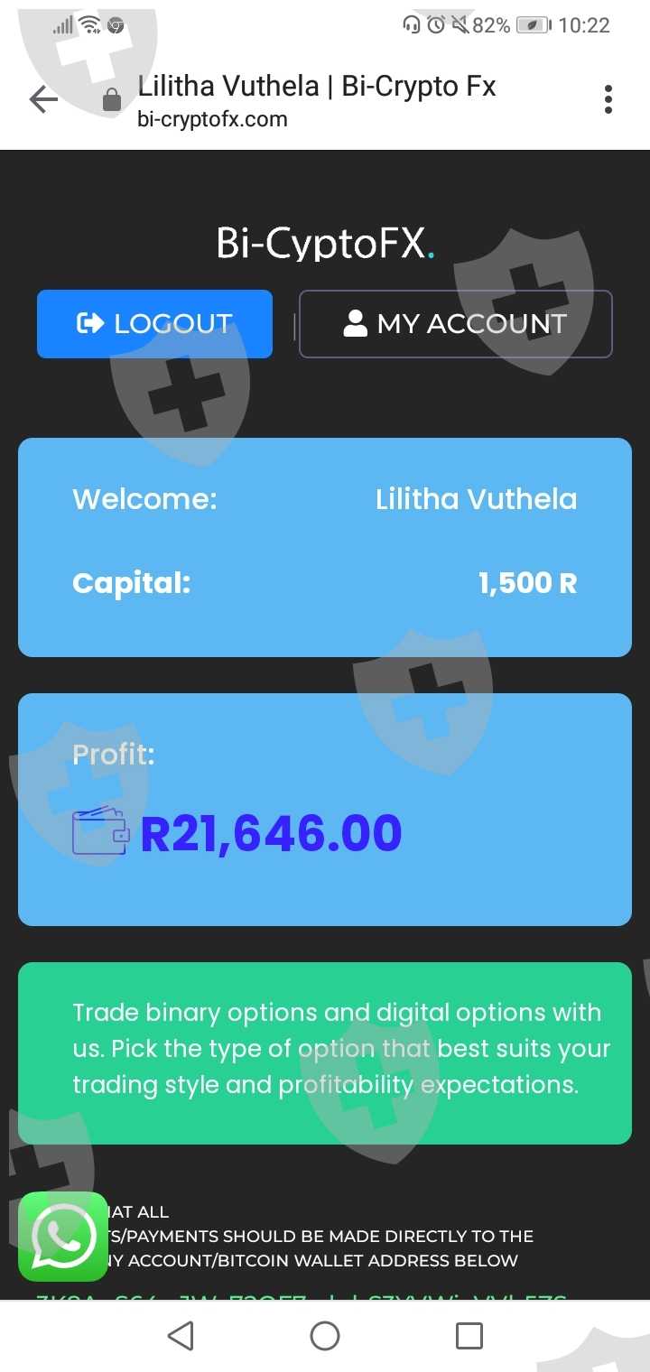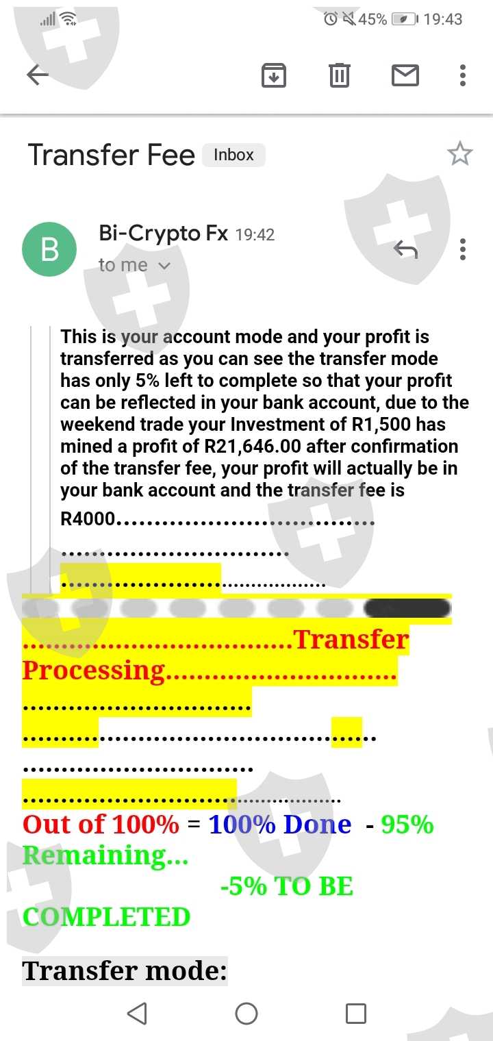 I made an investment of R1500 to Bi-cryptofx and they said the profit is 21000... Then when it was time to withdraw they wanted a withdrawal fee whereas they said nothing when approaching me, they said nothing about withdrawal fee.. But later on they wanted it before I get the profit... They took my R7000 at first then later on they wanted R1500 for insurance claiming its for cyber loss . So now they want another R2000 claiming that it's a signal fee... Please assist me