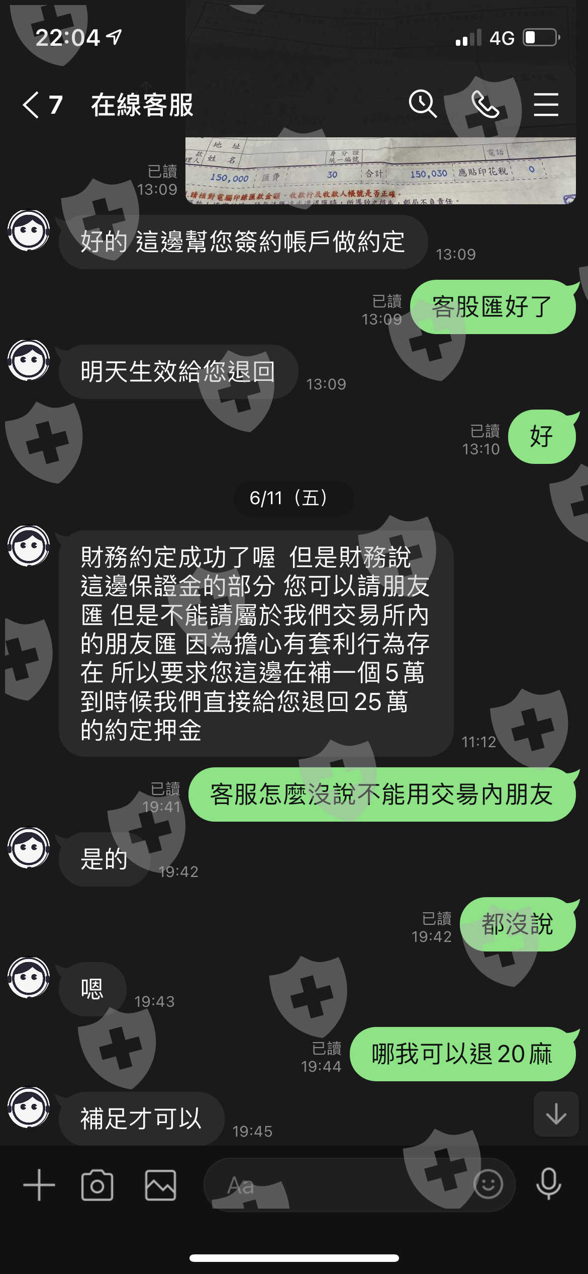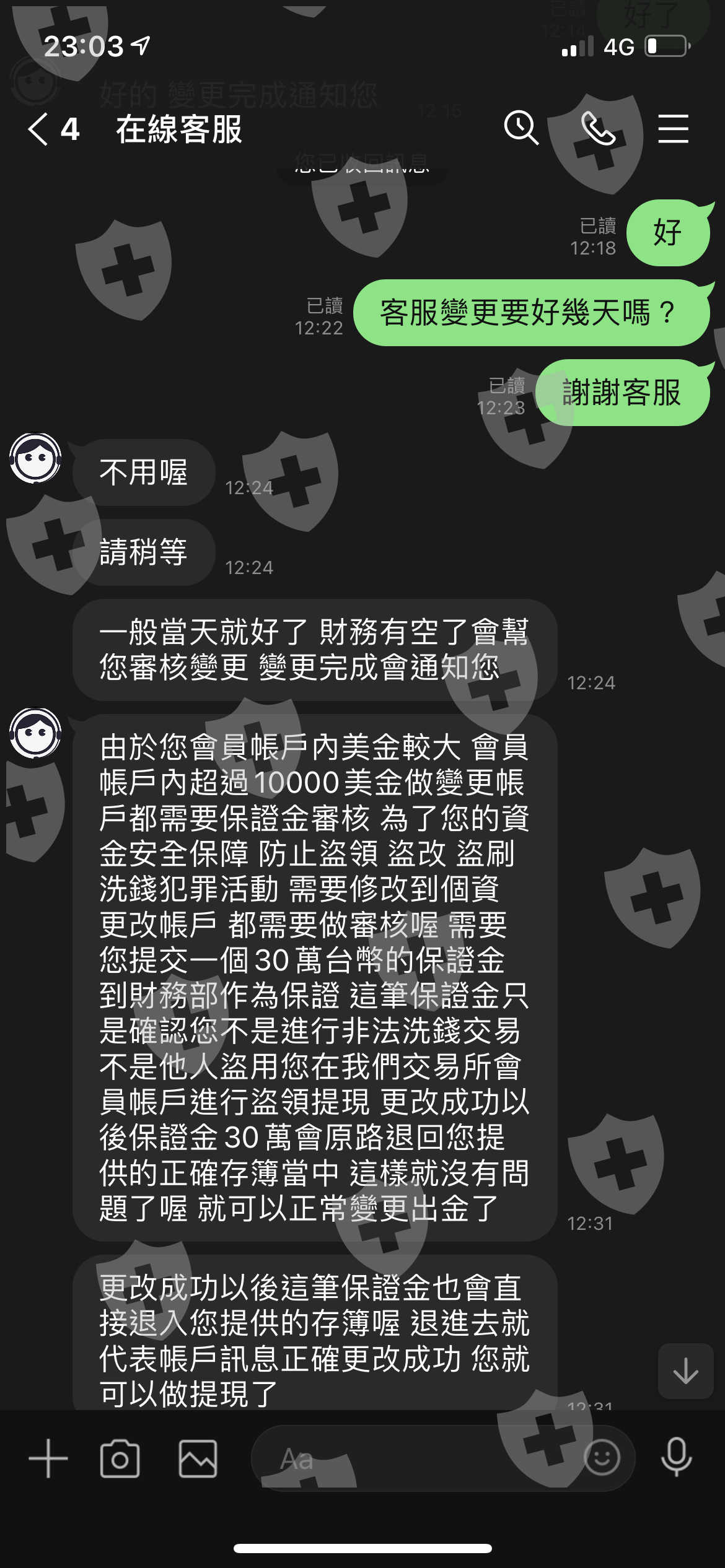 客服說要繳保證金才可出金,保證金已繳無發出金,說會退也沒退保證金,又說提現過大需要繳交約定金,我也繳約金定也沒退,平台有92246美元無法出金