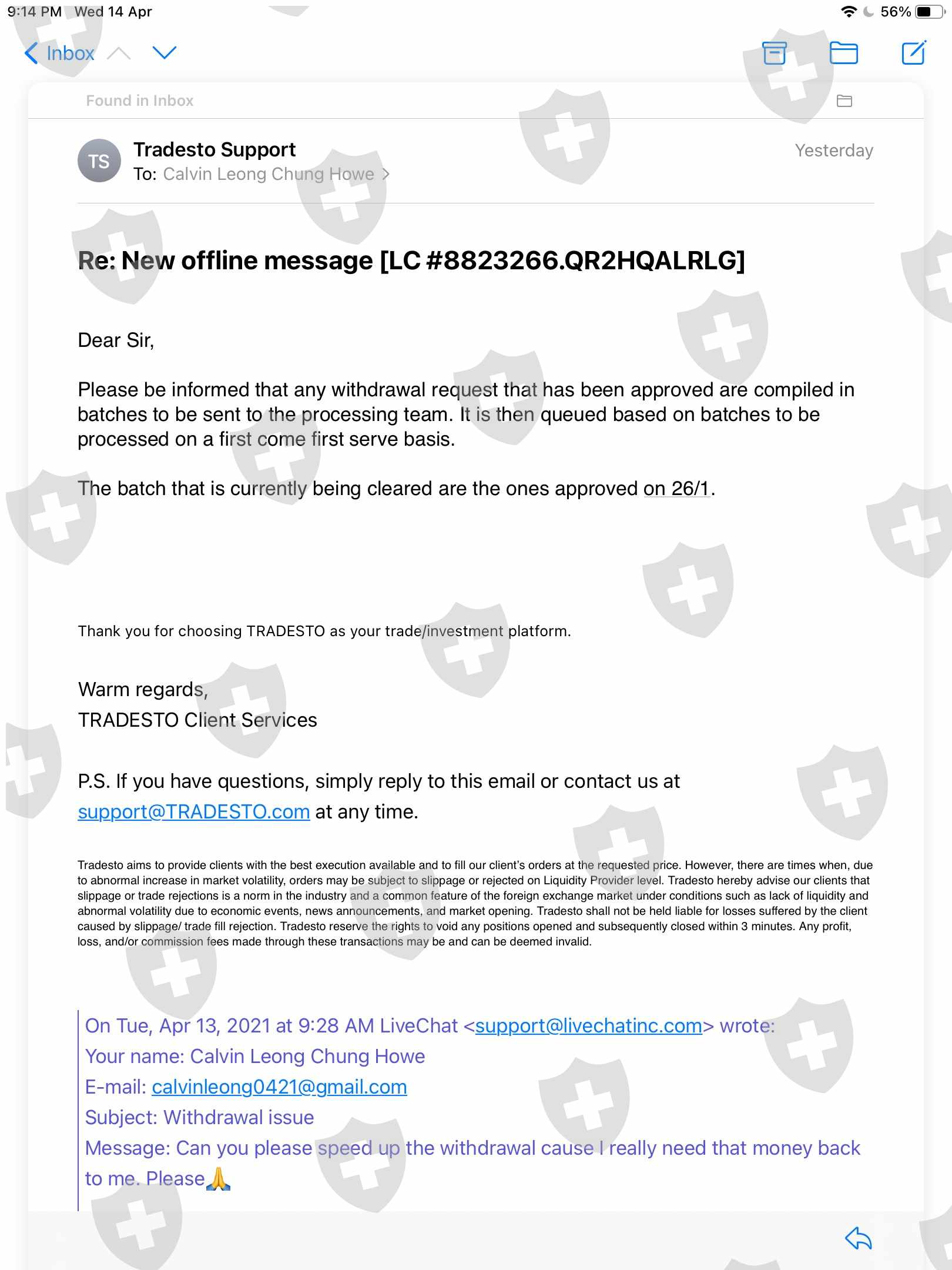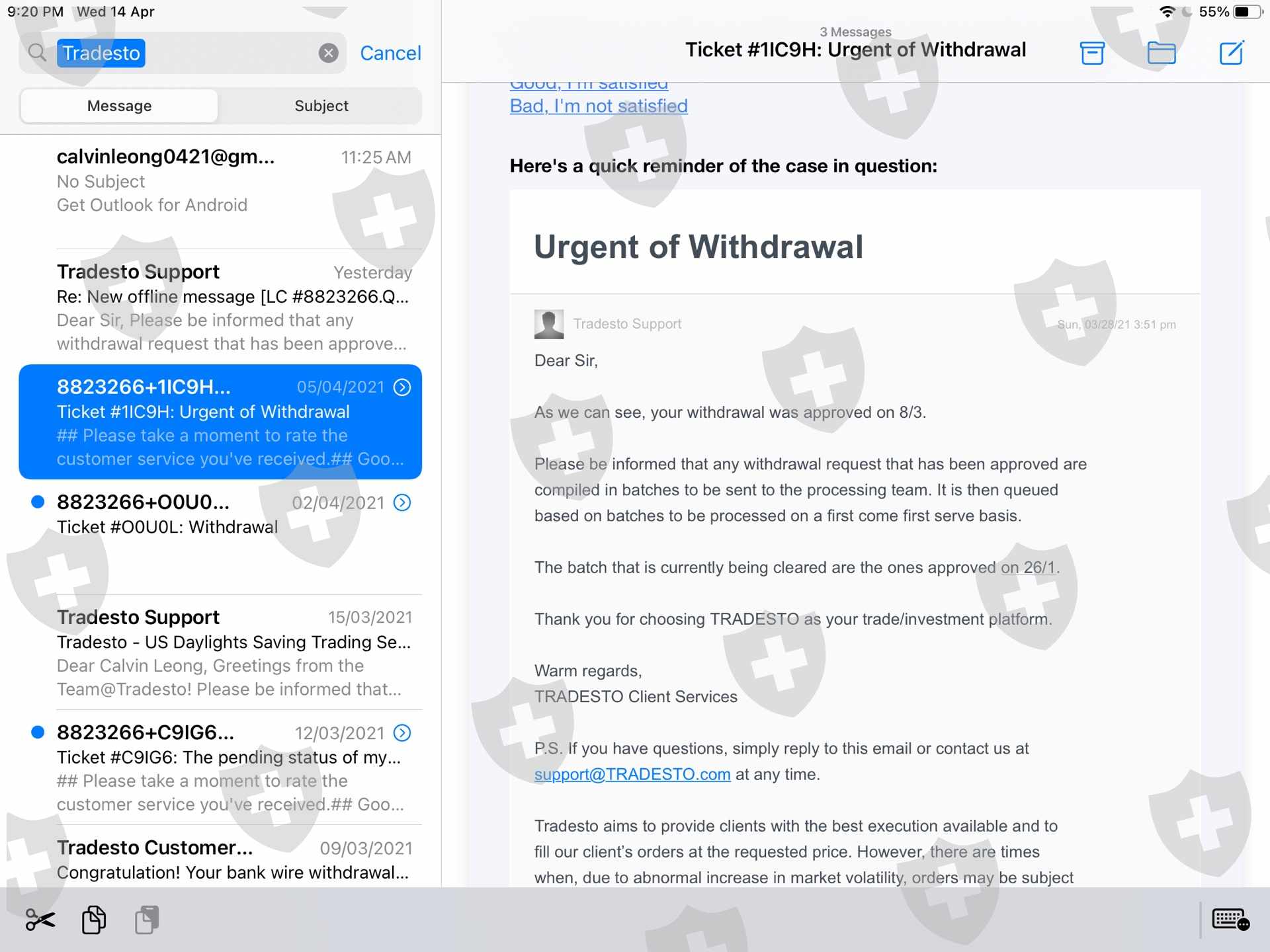 我的银行提款申请已于 2021 年 3 月 9 日获得批准。但我实际上比提款申请提前了 2 周,花了2周的时间获得批准。现在已经多少个月了,我还没有收到出金。我尝试联系客户服务,可以在图片中阅读他们所说的内容。