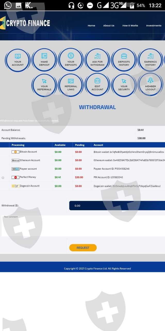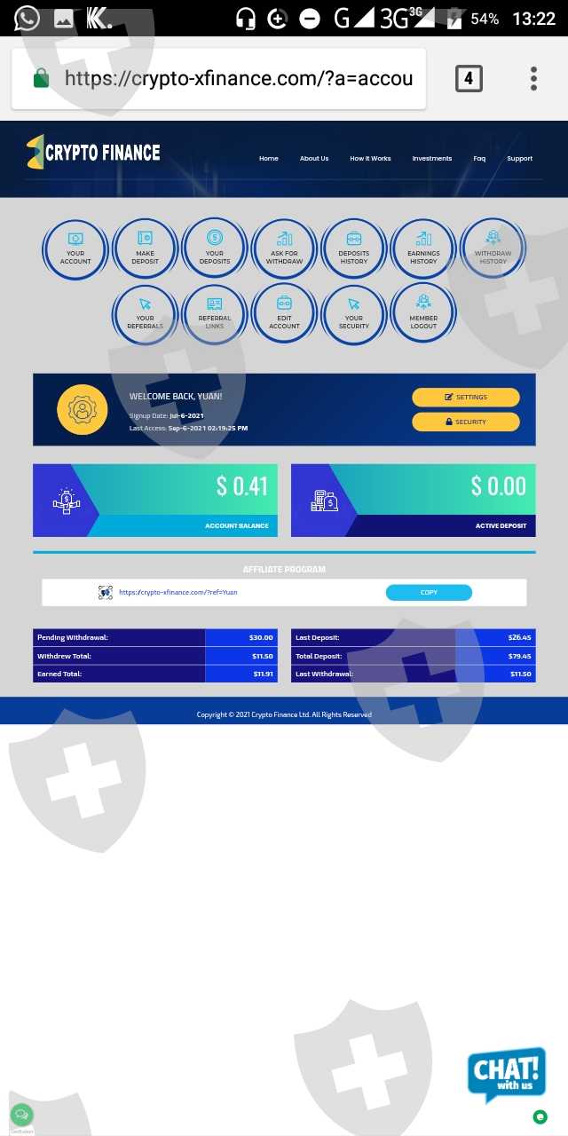 我在这个加密平台中被骗了,他们要求我在投资 10 美元后存入 10 美元,我只提取了 1.5 美元,但第二次提款被拒绝了,我和客户服务人员聊天,他们拉黑了我。这个网站是欺诈网站。