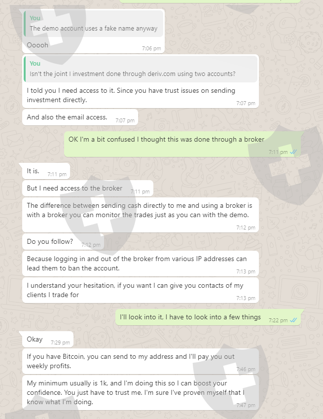 我在 Shapr 上认识的一个人试图说服我与他们“合作”进行外汇投资,SUPER BINARY。我资助这个项目,他们代表我交易,我们分摊收益。他们承诺每周至少有 5% 的回报。我们运行了一个装有 1 万美元虚拟货币的模拟账户,他们已经证明自己能够赚钱,承诺一切都将通过交易商完成,但现在要求我基本上向他们提供 Binary 帐户的登录详细信息,以便他们可以代表我进行交易。这一切都让我觉得非常可疑。这是外汇交易中的正常做法还是我一无所知?如果联合投资确定,它们将通过联合账户进行。我所有的交易都是通过加密货币进行的,只进行我自己的投资,所以外汇对我来说是全新的。但是我向他们存款后,无法访问我的帐户。能帮我抓住这个骗子吗?
