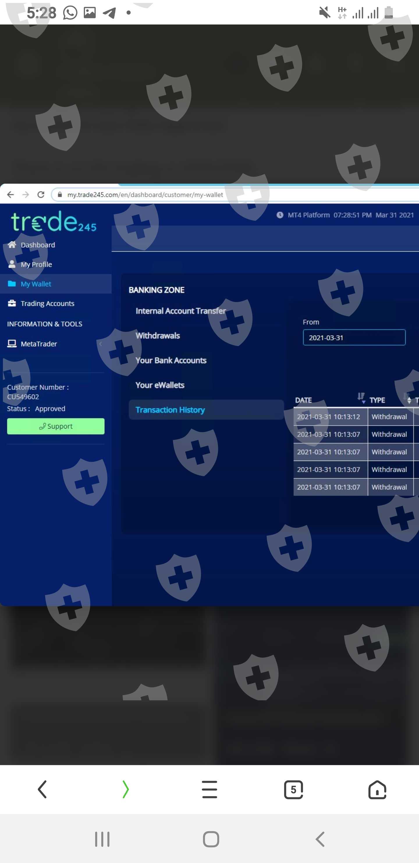 我的第一次提款申请日期是 23-03-2021,他们拒绝了并要求我提供文件。我已经提供,并且 25-03-2021 再次申请,还是被拒绝,要求在 Skrill 而不是 Bankwire 上提款。26-03-2021 、29-03-2021 和 01-04-2021 我继续要求提款,但都被拒绝了。