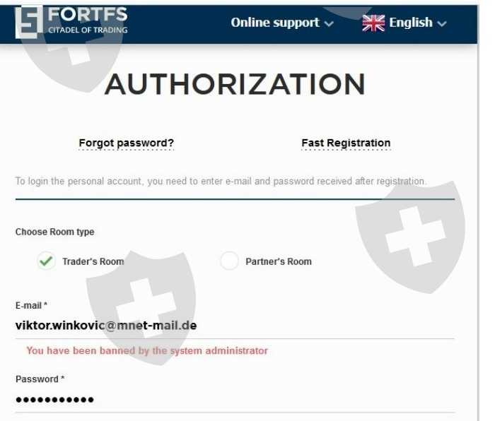 FORTFS骗了我 2500 美元,三周前我想关闭我的账户并出金。我的真实账户中有 2500 美元。在这个过程中,我被系统管理员拒绝了。当我尝试登录时,我收到消息“您已被系统管理员禁止登陆”。FORTFS不再回复我的电子邮件。